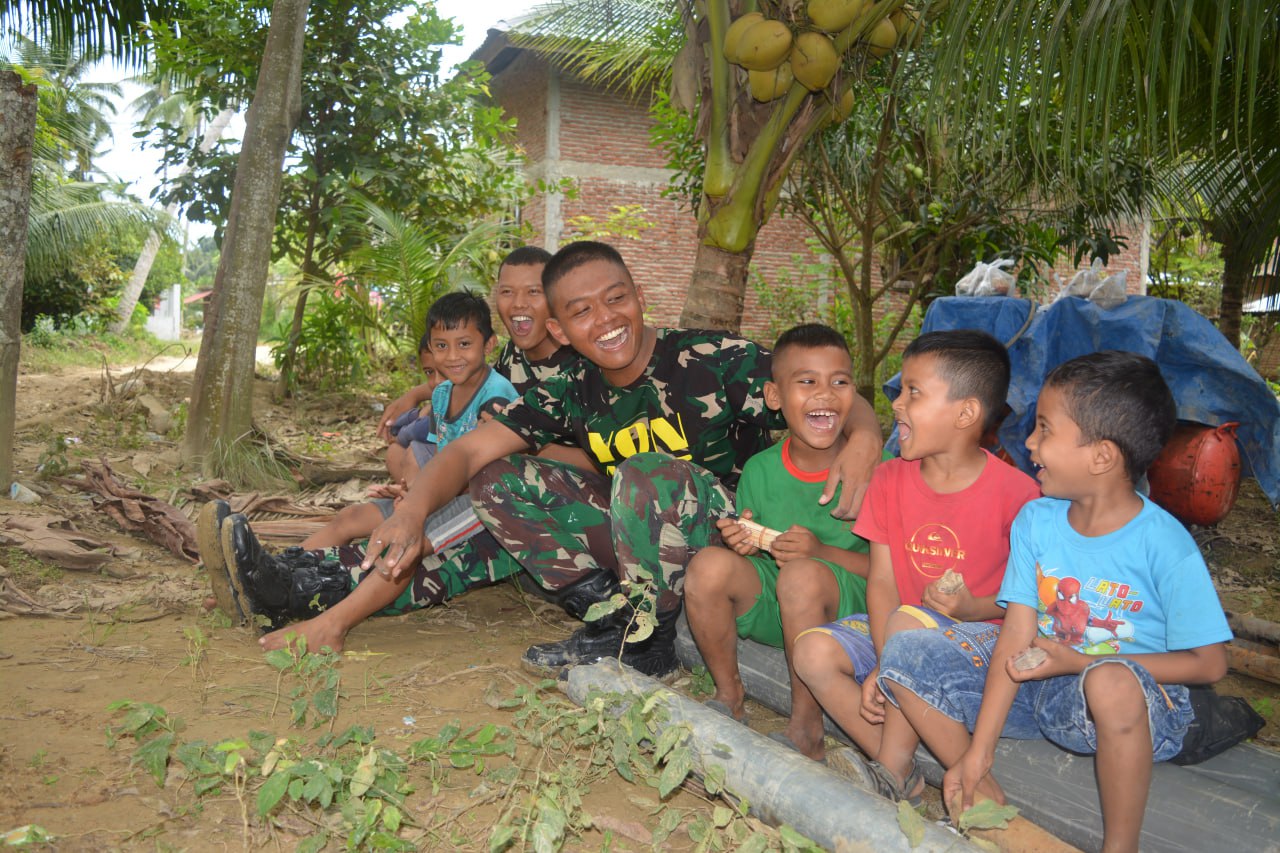 Disela-sela kesibukan dilapangan, anggota satgas TMMD menyempatkan waktu untuk berbagi perhatian dan kasih sayang dengan anak-anak di Gampong Paloh Punti, banyak momen yang menunjukkan kedekatan anggota Satgas TMMD dengan mereka.