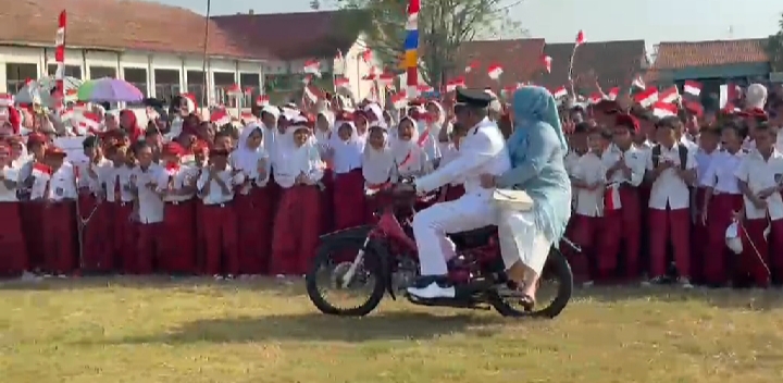 Momen unik sekaligus mengharukan terjadi setelah prosesi resmi berakhir. Sartija Arizona memilih menyapa warga dengan cara berbeda: memboncengi istrinya menggunakan motor tua miliknya. Pemandangan itu disambut tepuk tangan hangat warga.