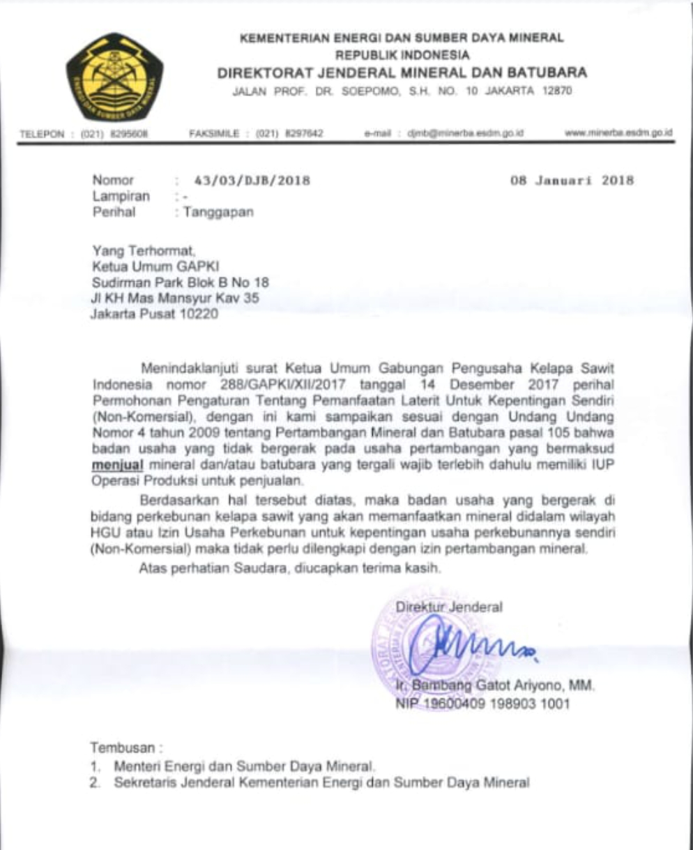 Surat yang ditujukan kepada Ketua Umum GAPKI menyebutkan bahwa badan usaha perkebunan yang memanfaatkan mineral dalam wilayah HGU untuk kepentingan sendiri (non-komersial) tidak memerlukan izin pertambangan mineral.