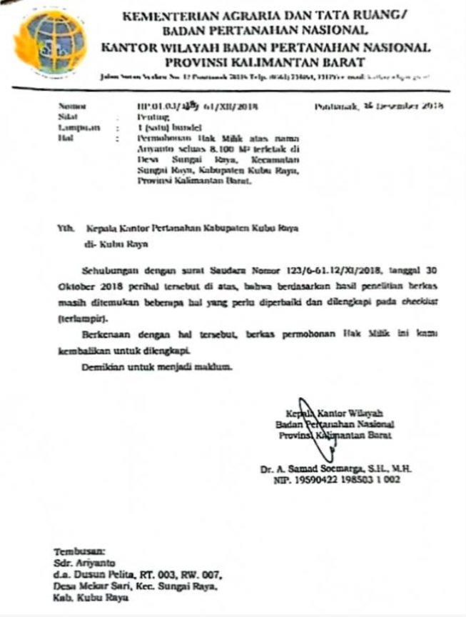 Teknis perbaikannya juga telah disebutkan secara terang oleh AR dalam persidangan bahwa yang MEMBUAT surat perbaikan adalah sdr. Edi Bagong (staf honorer BPN Kubu Raya) karena format perbaikan ada pada yang bersangkutan, setelah itu yang meminta tandatangan kepada sdr. Khairil Anwar selaku PJ Kades Sungai Raya th 2008 adalah sdr. Budi Suwarjono atas permintaan/DISURUH oleh sdr. Ariyanto selaku pemilik tanah sesuai Surat Pernyataan tanggal 22 Mei 2022 yang ditandatangani oleh sdr. Budi Suwarjono.