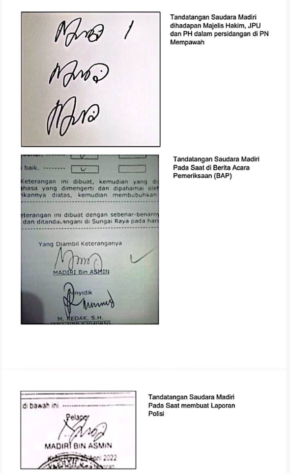 1. PERKARA INI DIDUGA KUAT ADALAH REKAYASA YANG DILAKUKAN OLEH PENYIDIK, yang dibuktikan dengan adanya rekaman video yang menyatakan sdr. Madiri tidak pernah melapor dan tidak tahu siapa yang melapor, tandatangan sdr. Madiri sebanyak tiga kali dipersidangan tanggal 3 Desember 2024 berbeda/tidak identik dengan yang ada dalam Laporan Polisi, BAP Korban an. Madiri, Surat Penyitaan dan Surat Tanda Penerimaan Barang Bukti, jawaban sdr. Madiri dalam BAP Korban yang ternyata sebagian besar adalah copy paste dari jawaban dalam BAP Saksi an. Moh. Nadin, Saksi an. Sayemah mengaku hanya diminta cap jempol dalam BAP yang sudah disiapkan oleh penyidik tanpa memberikan keterangan (fakta persidangan tanggal 3 Desember 2024), Saksi an. Asnawi mengaku hanya diminta tandatangan dirumahnya dalam BAP yang telah disiapkan oleh penyidik tanpa memberikan keterangan (fakta persidangan tanggal 3 Desember 2024), serta Kesaksian Verbalisan/Penyidik pada persidangan tanggal 9 Januari 2025 yang tidak dapat menunjukkan foto dokumentasi saat membuat BAP terhadap sdr. Madiri sehingga mengindikasikan bahwa benar terhadap sdr. Madiri tidak pernah dilakukan pemeriksaan oleh penyidik Polres Kubu Raya.