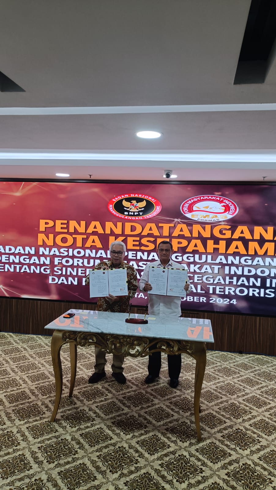 MoU tersebut ditandatangi oleh Sekretaris Utama (Sestama) BNPT Bangbang Surono, Ak., M.M., C dan Ketua Umum Formas Yohanes Handojo Budhi Sedjati SH.CCP, yang merupakan sebagai bentuk implementasi konsistensi dalam bersinergi dari berbagai pihak, yang berlangsung di Kantor BNPT Jakarta, Senin (07/10/24).