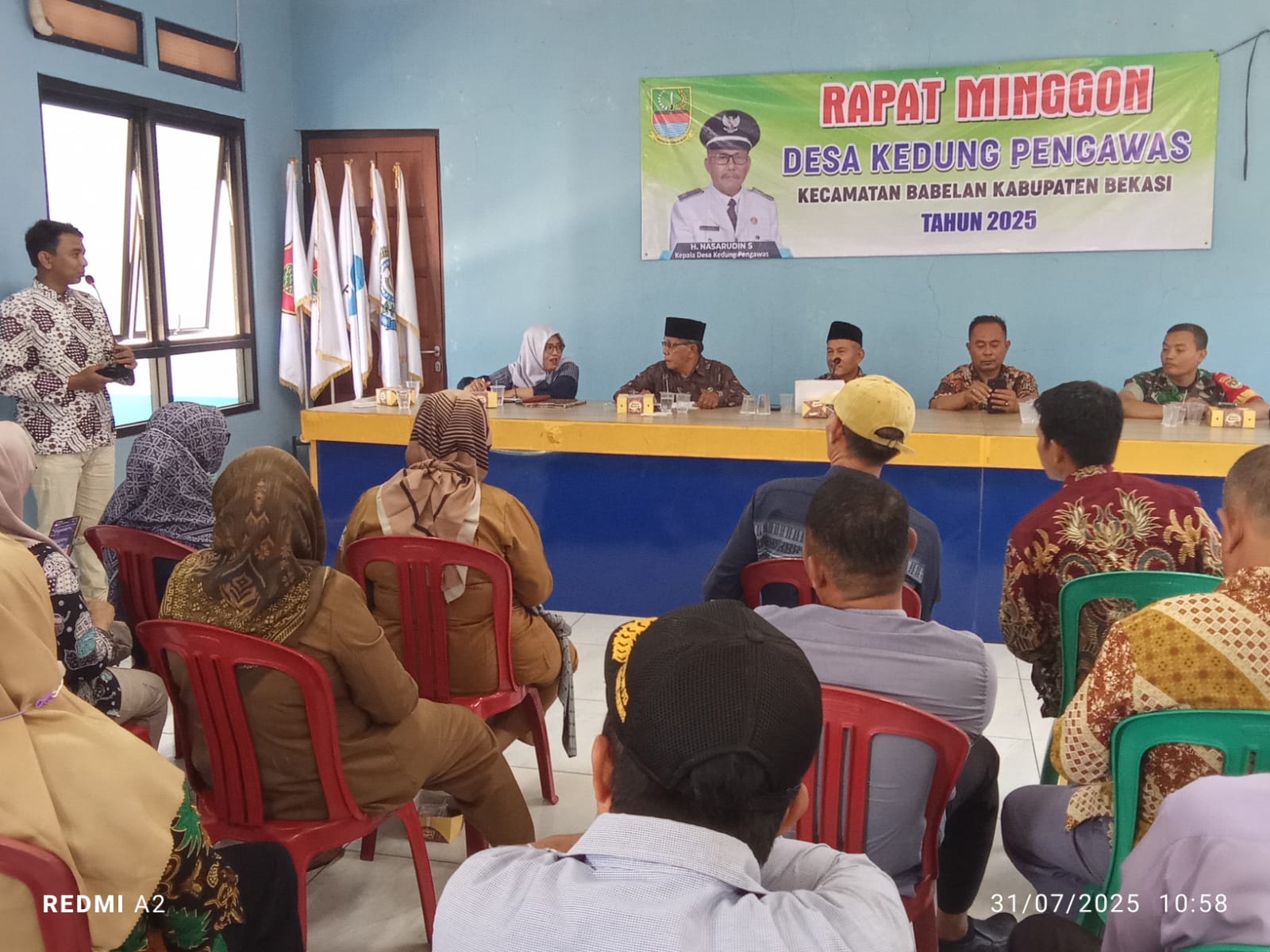Mediaberitapantau.web.id, Babelan — Pemerintah Desa Kedung Pengawas, Kecamatan Babelan, Kabupaten Bekasi menggelar rapat minggon desa yang berlangsung di aula kantor desa, Kamis (31/7/2025). Rapat tersebut dihadiri langsung Kepala Desa Kedung Pengawas H. Nasarudin S, Ketua BPD, Bimaspol, Babinsa, serta para pengurus RW dan RT se-Desa Kedung Pengawas.