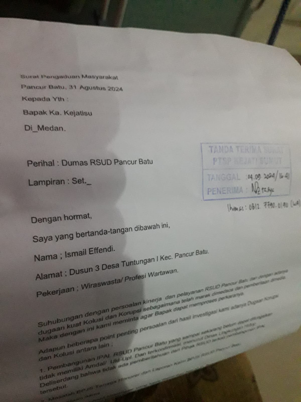 “Ya benar kami telah membuat Dumas terkait dugaan adanya Tindak Pidana Korupsi RSUD Pancur Batu ke Kejatisu”, tegas Is