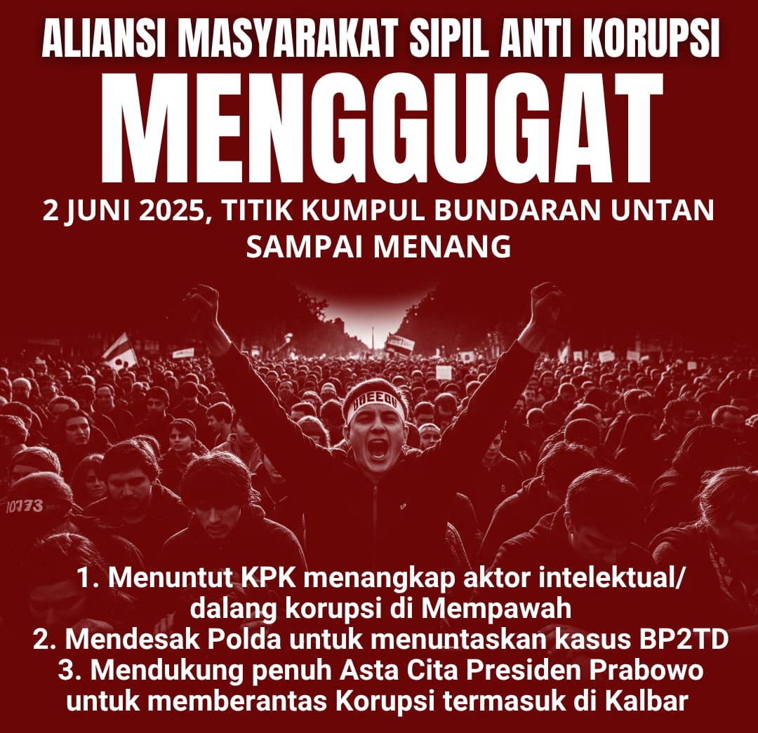 Mediaberitapantau.web.id~Kalimantan Barat – 1 Juni 2025.Seruan keras untuk penegakan hukum yang tegas dan bebas dari intervensi politik kembali menggema di Kalimantan Barat. Aliansi Masyarakat Sipil Anti Korupsi menegaskan tuntutannya agar penanganan dugaan kasus korupsi di Kabupaten Mempawah segera diusut hingga tuntas. Pernyataan sikap ini rencananya akan disampaikan secara terbuka pada aksi yang digelar di Bundaran Tugu Degulis Untan, Kota Pontianak, pada 2 Juni 2025.
