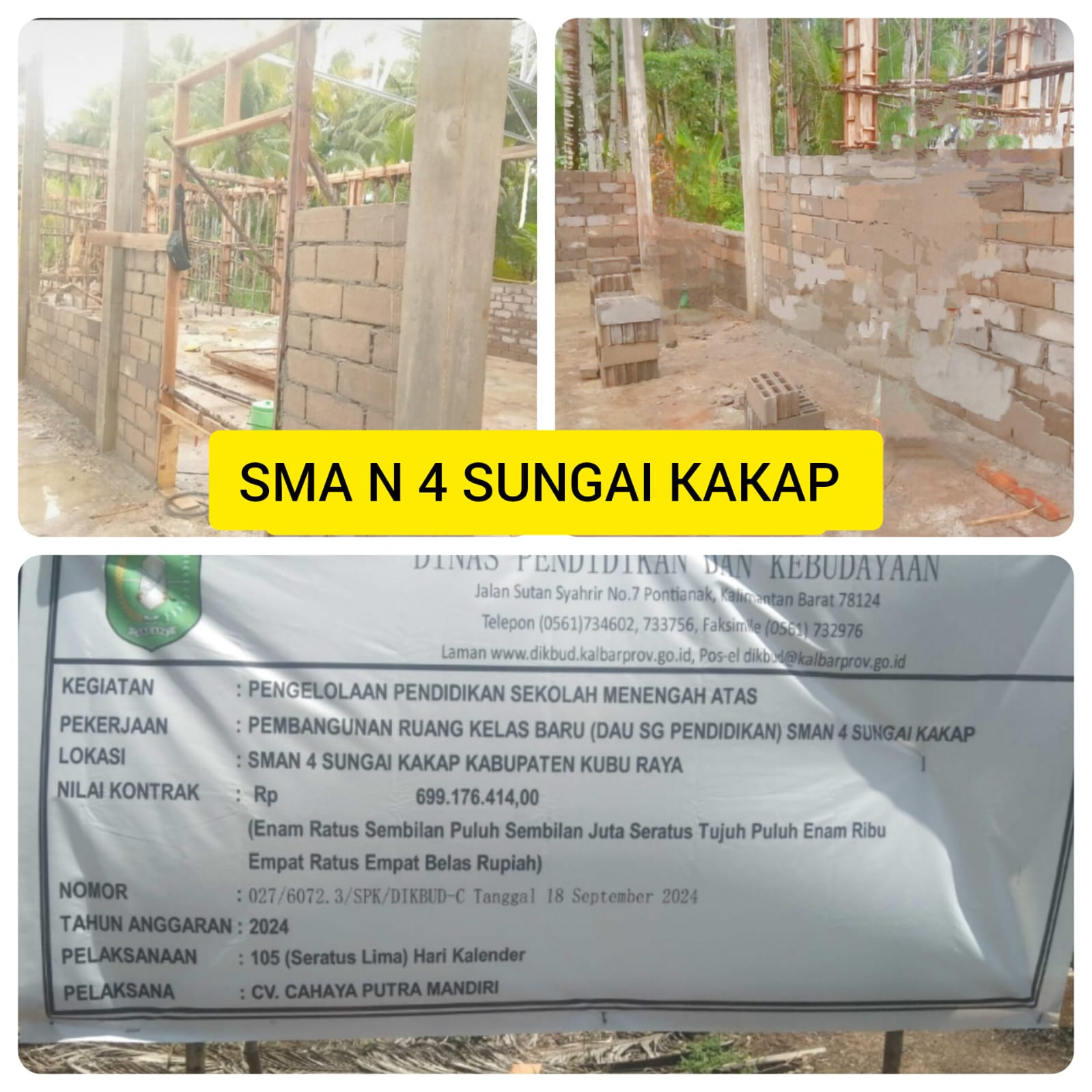 Namun, tim awak media online dan LSM menemukan di lapangan bahwa pelaksana yang sama, yang bertanggung jawab untuk proyek pembangunan SMK N 1 Terentang, dengan inisial (A), juga terlibat dalam proyek SMA N 4 Sungai Kakap. Berdasarkan pemantauan di lapangan, progres pekerjaan sangat minim, baru mencapai sekitar 40%, dengan hanya beberapa pekerja yang terlibat. Kegiatan yang seharusnya telah mencapai tahap penyelesaian, seperti pembangunan toilet, ruang kelas baru, dan ruang guru, belum terlihat signifikan, bahkan baru mencakup pemasangan kusen pintu dan penyusunan dinding batako setinggi 1,5 meter.