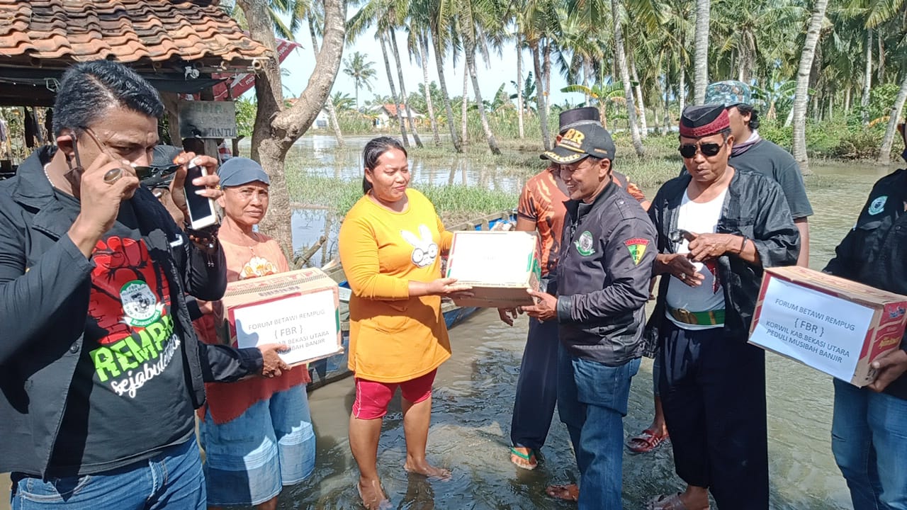 Beritapantau.onlin l bekasi- Organisasi Masyarakat (ORMAS) Forum Betawi Rempug (FBR) Kordinator Wilayah (KORWIL) Kab.Bekasi Utara bagikan sembako kepada warga yang terdampak bankir di wilayah Kampung Ponombo Desa Pantai Harapan Jaya, Kecamatan Muara Gembong, Kabupaten Bekasi.