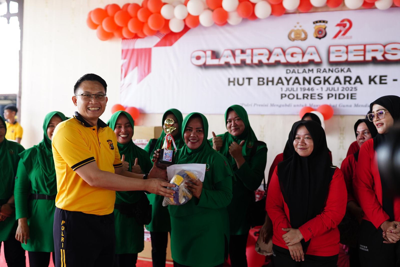 Selain pertandingan voli, kegiatan pagi itu juga diisi dengan jalan santai, senam kebugaran, serta pembagian doorprize yang turut diikuti oleh ratusan peserta dari berbagai unsur — mulai dari personel Polri dan TNI, Forkopimda, stakeholder di Kabupaten Pidie, hingga ibu-ibu Bhayangkari, Persit, dan PKK.