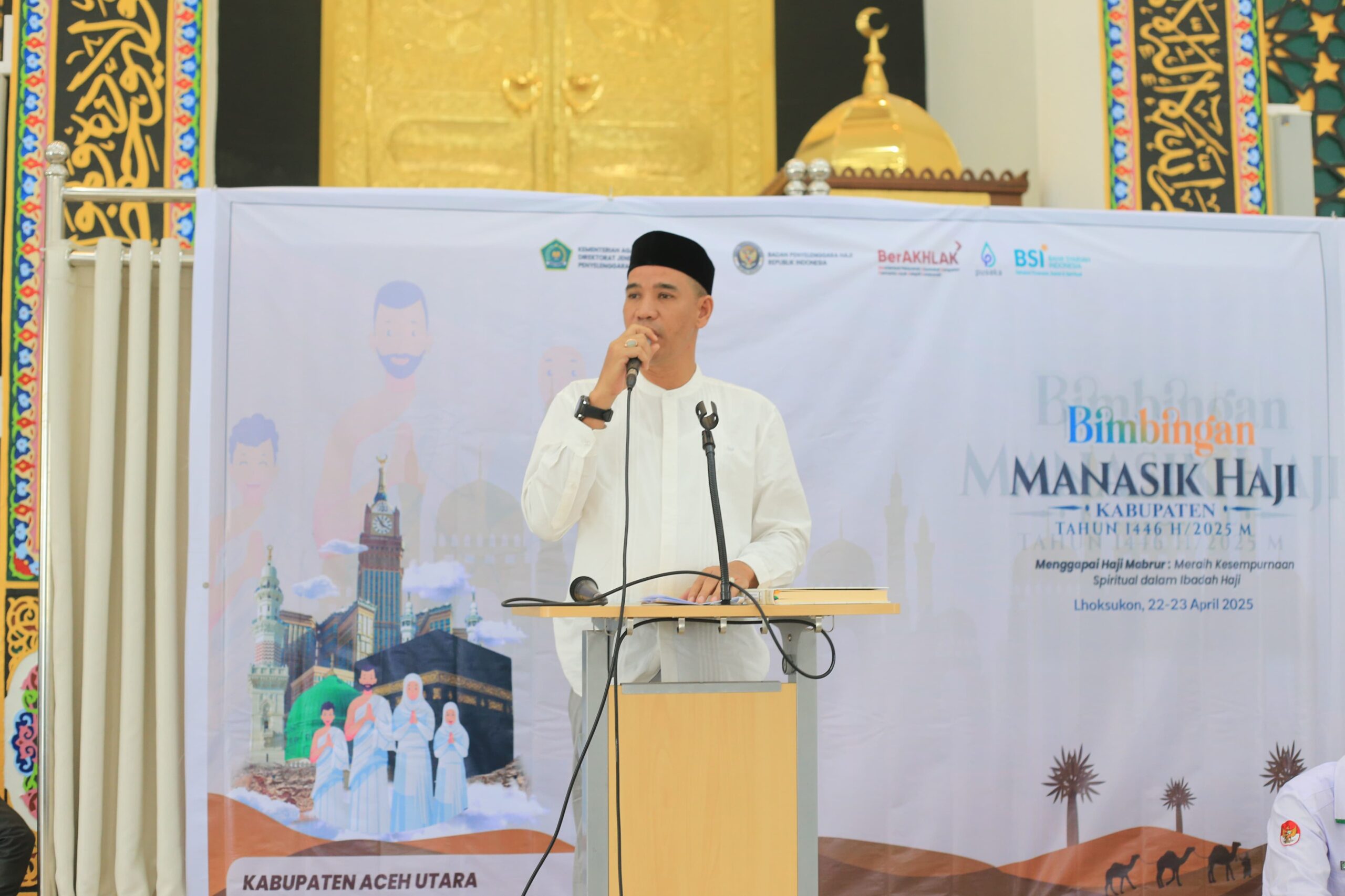 Media Berita Pantau Aceh Utara – Wakil Bupati Aceh Utara, Tarmizi, S.I.Kom., membuka kegiatan Manasik Haji Kabupaten Aceh Utara 1446H, tahun 2025 di Masjid Haji Muhammad Hanafiah, Gampong Ranto, Lhoksukon, Selasa (22/4/2025). Sebanyak 399 jamaah calon haji dari kabupaten itu telah melunasi biaya haji dan siap diberangkatkan ke Tanah Suci tahun ini.
