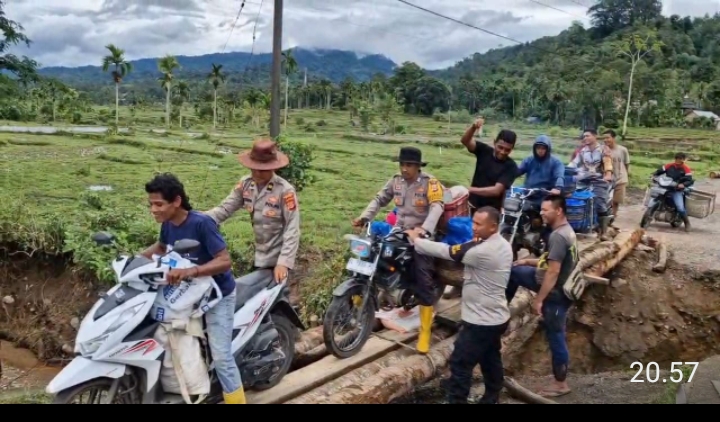 “Selanjutnya personel Polsek Mane bersama warga setempat secara gotong royong membuat jembatan darurat dari batang kelapa sehingga bisa dilintasi kendaraan dua’, ucap Kapolres Pidie AKBP Jaka Mulyana, SIK.MIK.