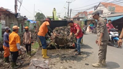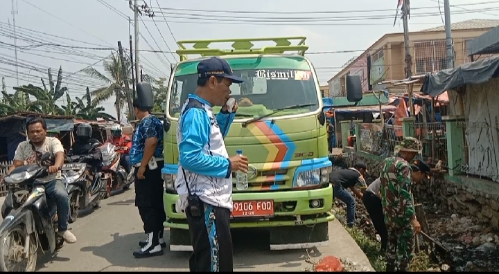 MEDIABERITAPANTAU, BABELAN ~ Kepala Desa Babelan Kota, Saidih David hadir dalam kegiatan gotong royong pengangkutan sampah di saluran air depan Pasar Babelan, Desa Babelan Kota, Kecamatan Babelan, pada Selasa (01/10/2024) pagi.