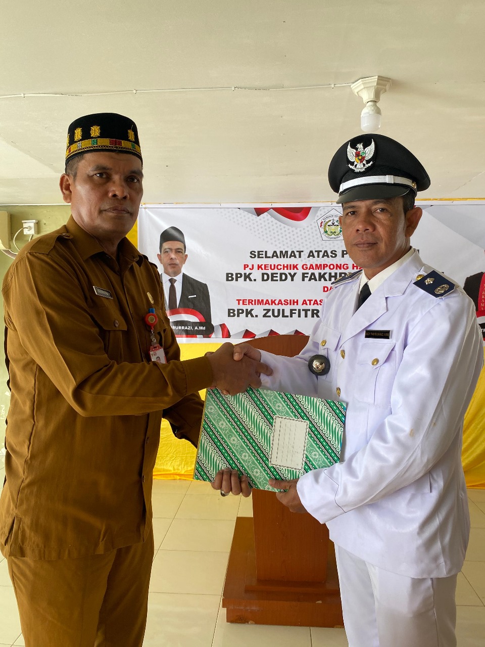 Acara berlangsung khidmad diluar Meunasah dengan deretan papan bunga dengan ucapan selamat kepada pejabat (pj) Keuchik Dedy Fakhrurrazi, A.Md. (R)
