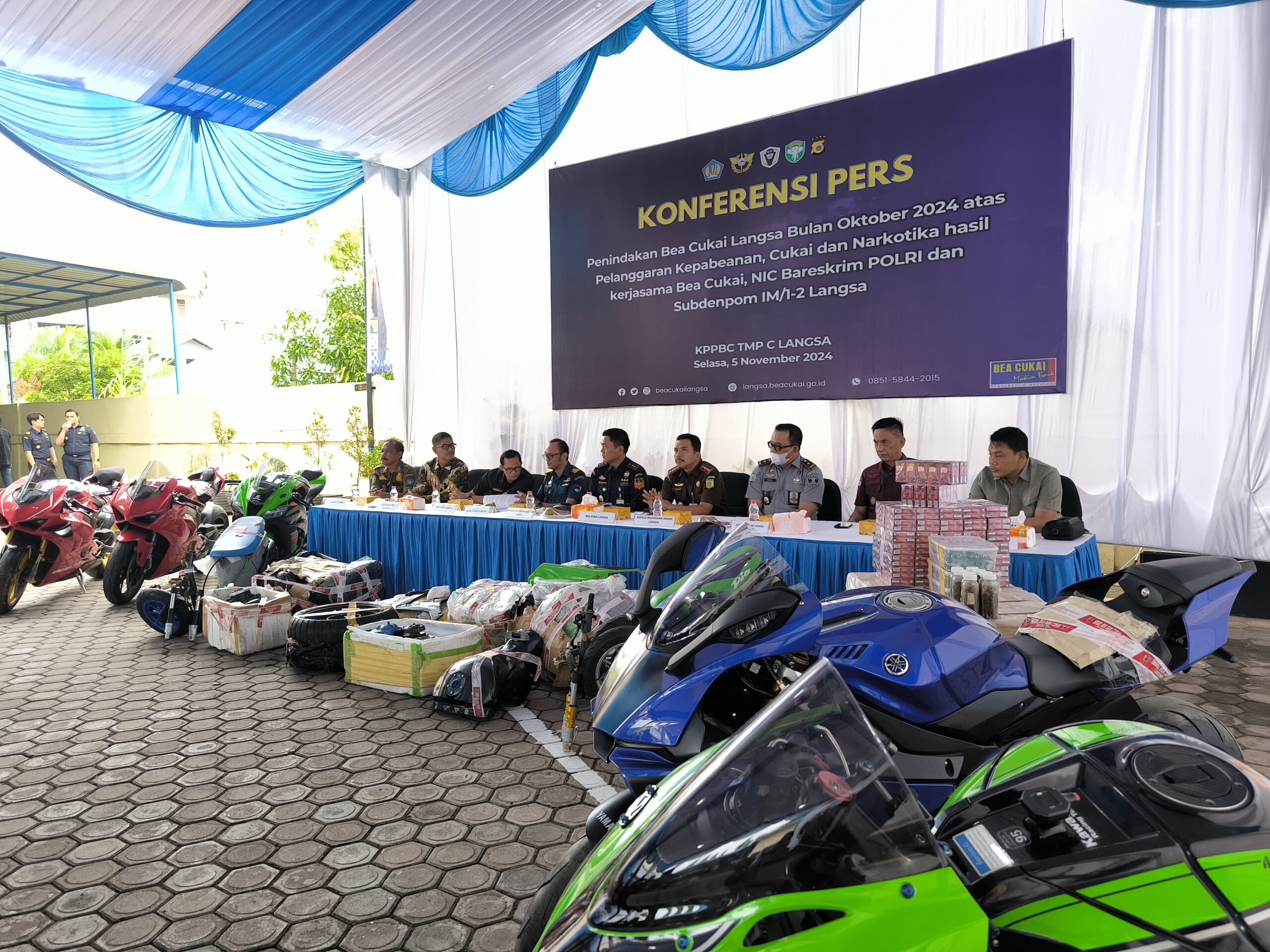 Media Berita Pantau Langsa – Kepala Lembaga Pemasyarakatan Kelas IIB Langsa, A. Halim Faisal didampingi Kasi Binagiatja, Guntur dan staf menghadiri Undangan Konferensi Pers dari Bea Cukai Langsa, yang di laksanakan di Halaman depan Kantor Pengawasan dan Pelayanan Bea dan Cukai Tipe Madya Pabean C Langsa, JI. Cut Nyak Dhien Kota Langsa. Selasa (5/11/2024)
