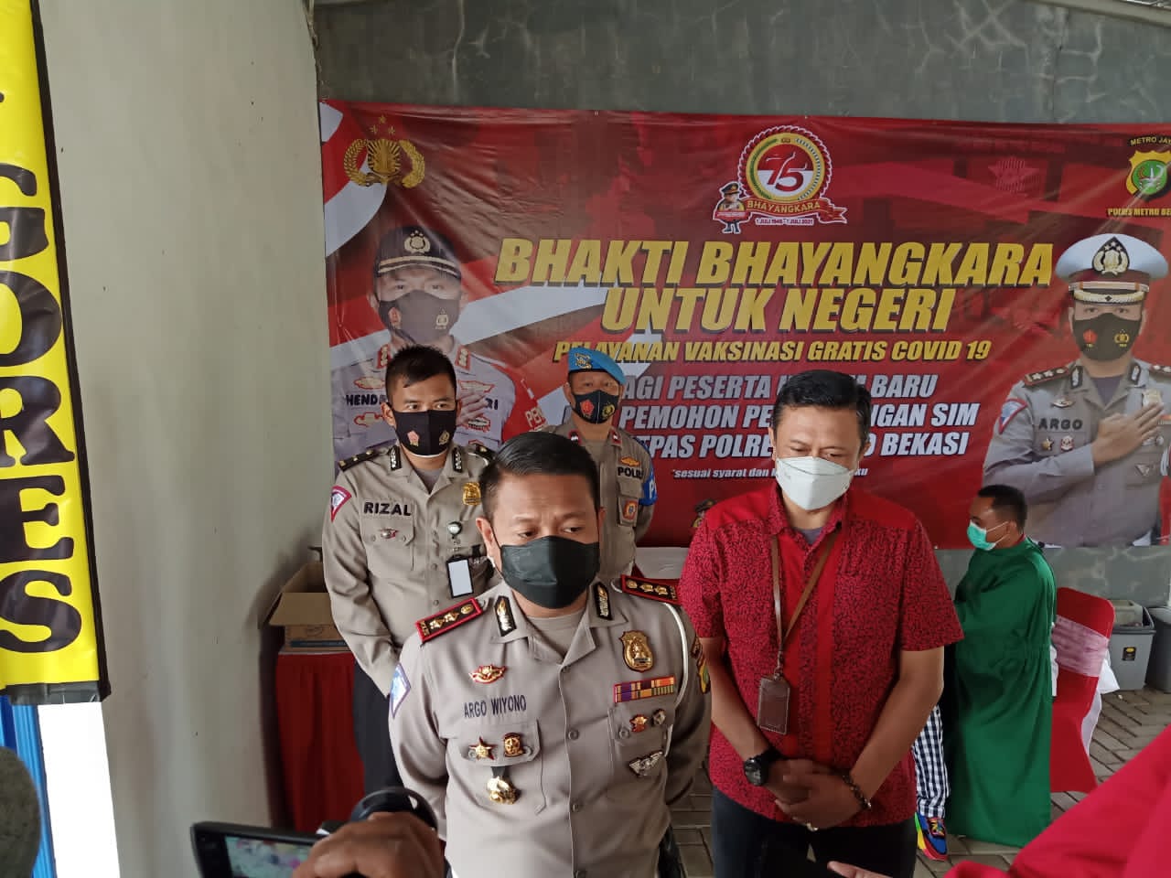 Kasat lantas polres metro Bekasi AKBP Argo Wiyono di damping Kanit sim kabupaten Bekasi AKP Ari Purnomo, yang memantau langsung vaksinasi kepada para pemohon SIM, mengaku apa yang di lakukan dalam rangka hari jadi byangkara ke 75, dan juga mengikuti program pemerintah satu juta perhari lakukan vaksinasi.