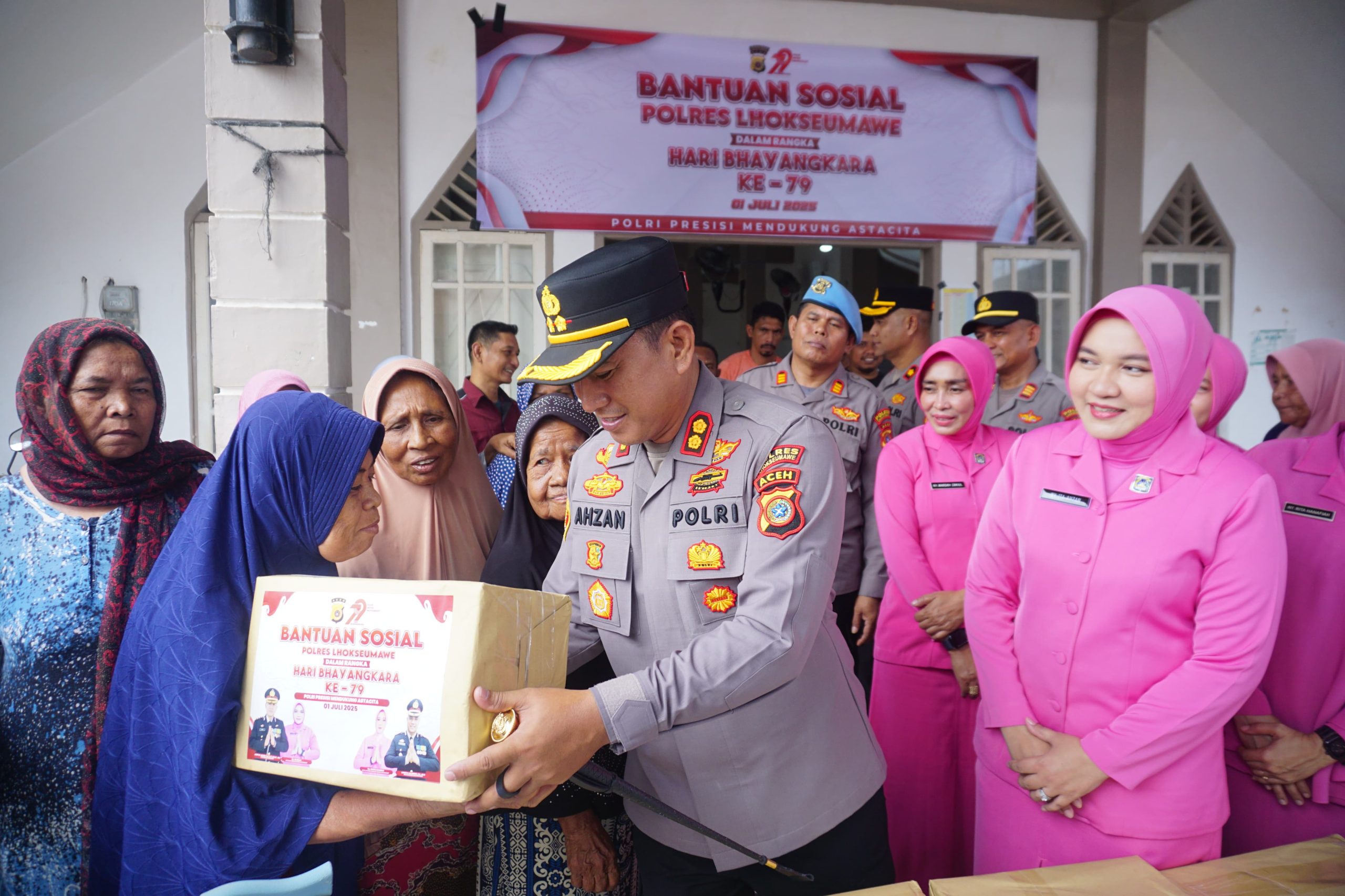 Media Berita Pantau Lhokseumawe – Menyambut Hari Bhayangkara ke-79, Kapolres Lhokseumawe AKBP Dr. Ahzan, SH, SIK, MSM, MH bersama jajaran dan pengurus Bhayangkari Cabang Lhokseumawe melaksanakan kegiatan silaturrahmi serta pembagian bantuan sosial (bansos) kepada masyarakat di Meunasah Gampong Pusong Lama, Kecamatan Banda Sakti, Kota Lhokseumawe, Selasa (17/6/2025) pagi.