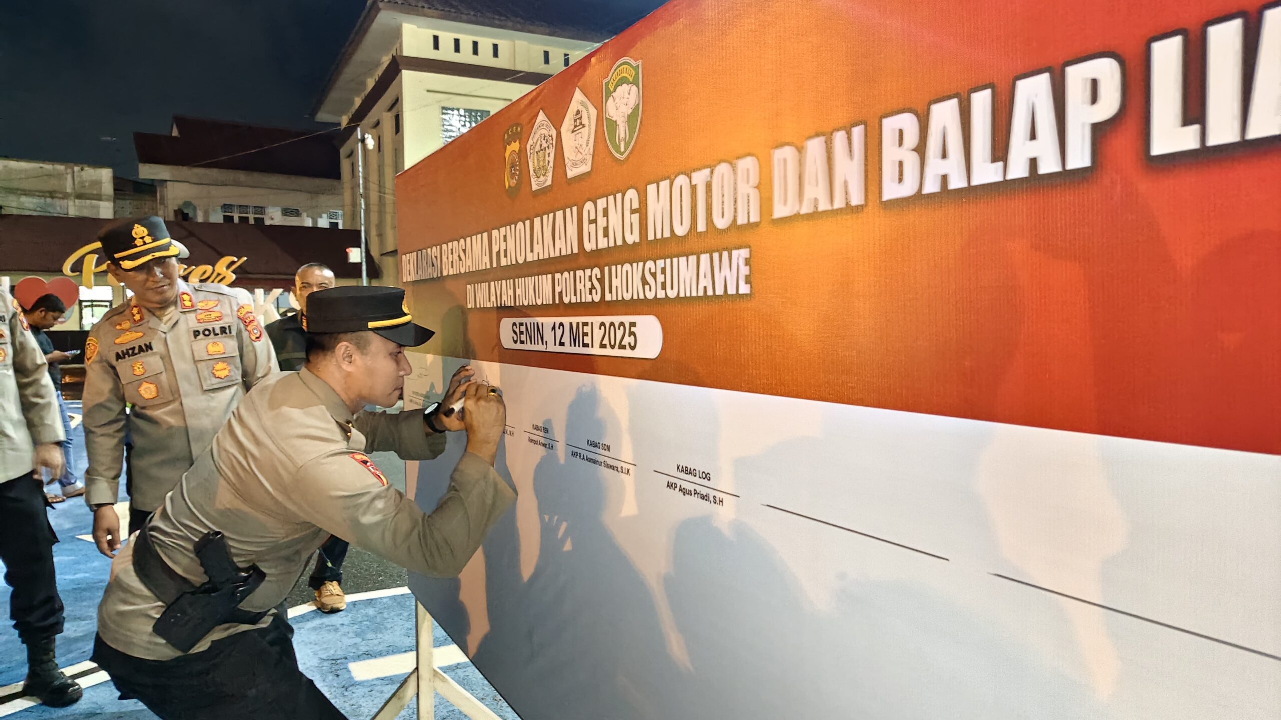 Media Berita Pantau Lhokseumawe – Kapolres Lhokseumawe, AKBP Dr. Ahzan, S.H., S.I.K., M.S.M., M.H., memimpin langsung deklarasi bersama penolakan terhadap geng motor dan aksi balap liar yang berlangsung di Kota Lhokseumawe, Senin (12/5/2025) malam.