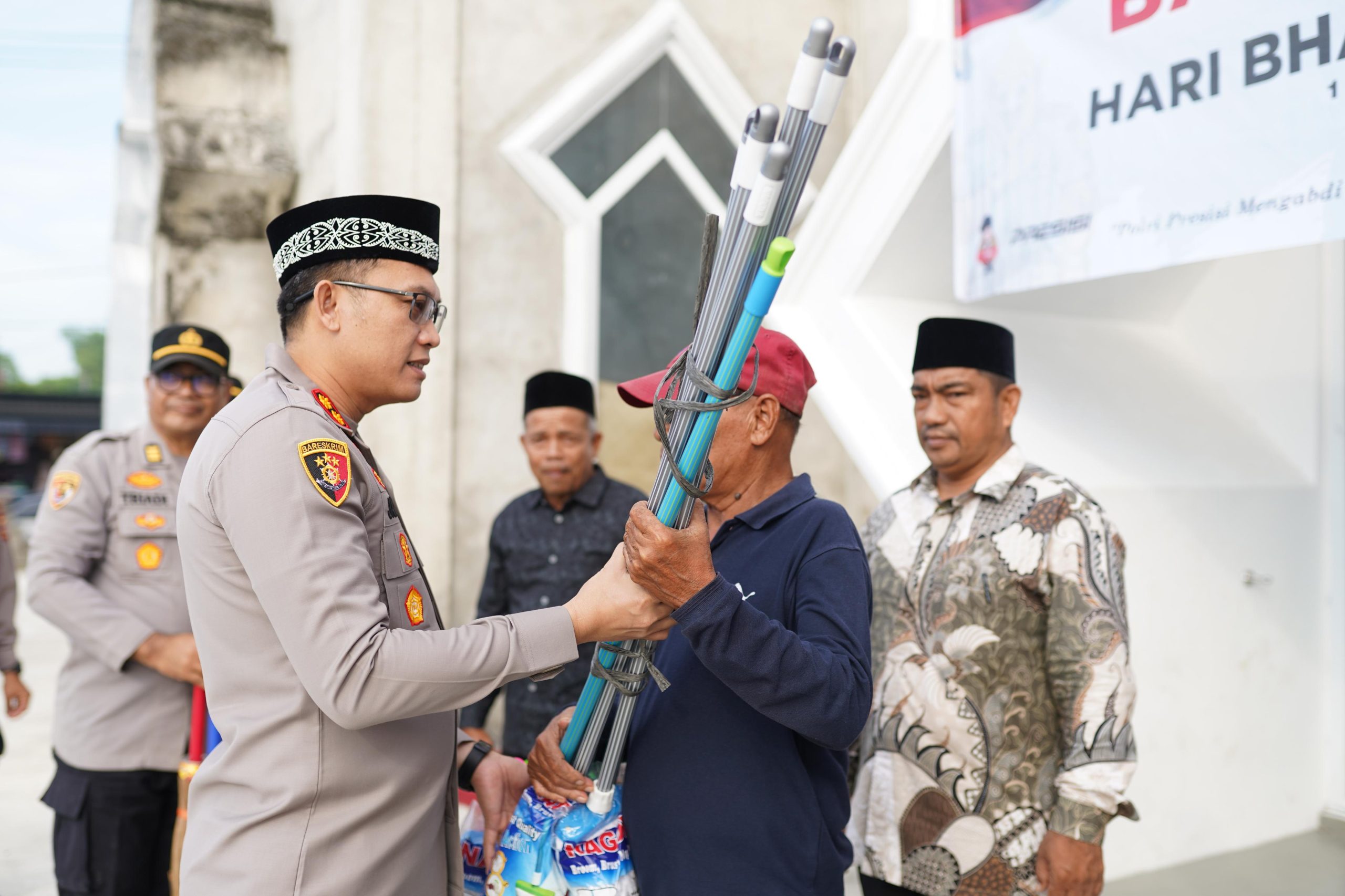 Penyerahan dilakukan secara langsung oleh Kapolres didampingi Wakapolres Kompol Dwi Arys Purwoko, S.IP.S, SIK, MH dan sejumlah pejabat utama Polres Pidie. Bantuan yang diberikan meliputi alat pel, sapu, ember, dan perlengkapan kebersihan lainnya untuk mendukung kebersihan dan kenyamanan tempat ibadah.