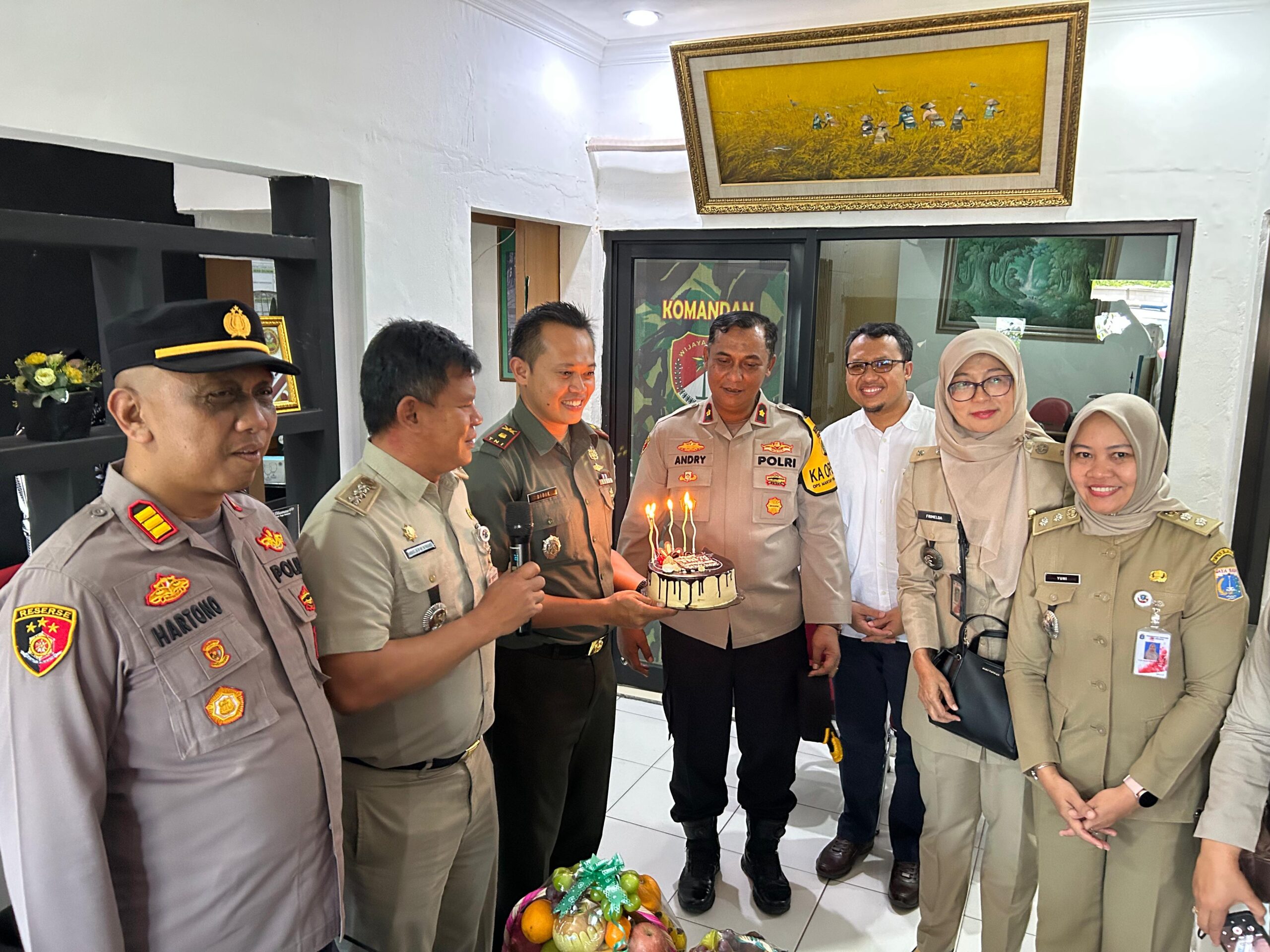 Kapolsek Koja Polres Metro Jakarta Utara Kompol Andry Suharto didampingi Wakapolsek AKP Hartono, Para Kanit, Panit, Kasie, Kapolsubsektor dan Bhabinkamtibmas memberikan surprise Party dalam rangka HUT TNI ke-79 Tahun.