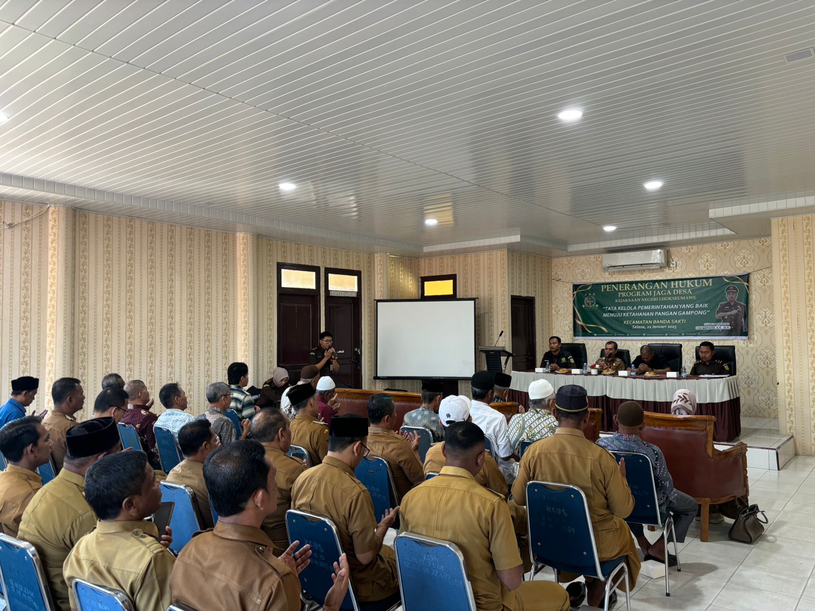 Media Berita Pantau Lhokseumawe — Dalam rangka Program Jaga Desa Kejaksaan Negeri Lhokseumawe, melaksanakan penerangan hukum program jaga desa yang bertema “Tata Kelola Pemerintah Yang Baik Menuju Ketahanan Pangan Gampong, acara berlangsung di Aula Kantor Camat Banda Sakti, Kota Lhokseumawe, Selasa (21/1/ 2025).
