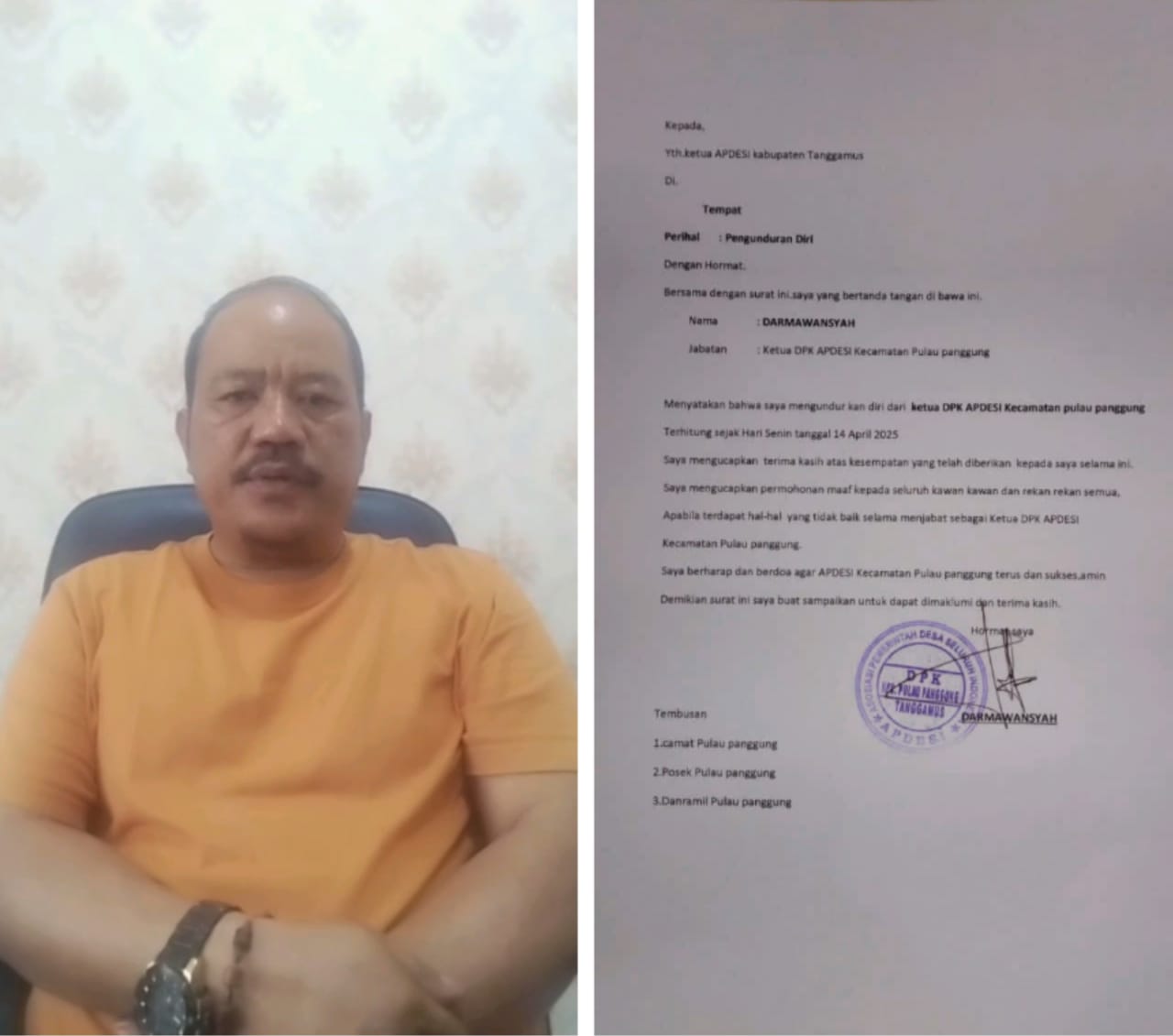Mediaberitapantau.web.id TANGGAMUS — Ketua Dewan Pimpinan Kecamatan (DPK) Asosiasi Pemerintah Desa Seluruh Indonesia (APDESI) Kecamatan Pulau Panggung, Darmawansyah, resmi mengundurkan diri dari jabatannya, terhitung sejak Senin, 14 April 2025.