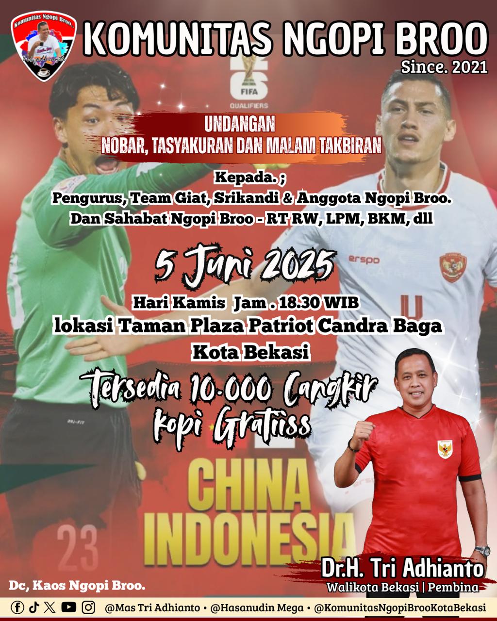 Mediaberitapantau.web.id KOTA BEKASI — Komunitas Ngopi Broo Hadir Menyediakan 10.000 Kopi Gratis dalam Rangka Nobar, Tasyakuran dan Malam Takbiran, bertempat di Lokasi Taman Plaza Patriot Candra Baga, Kota Bekasi.