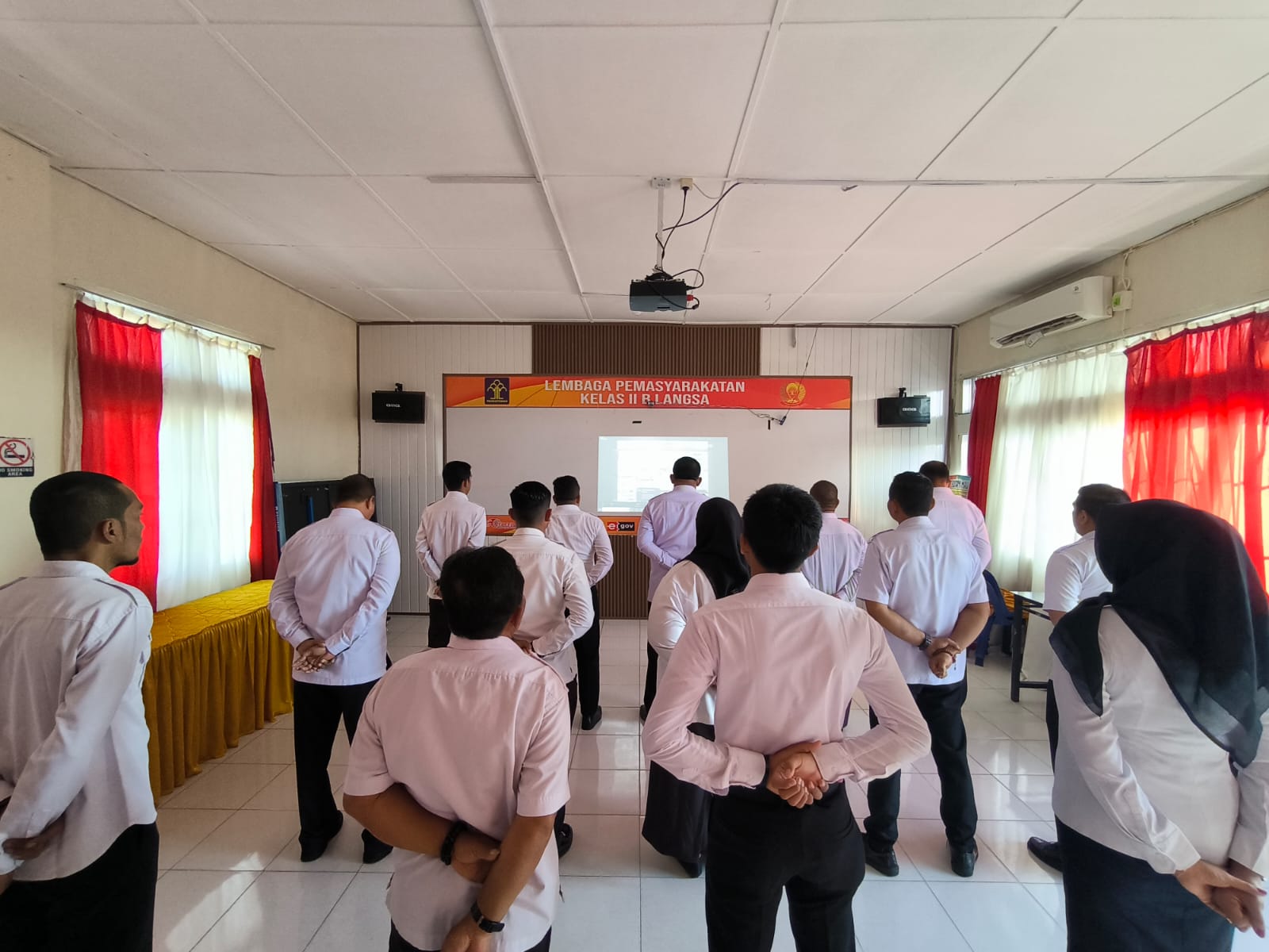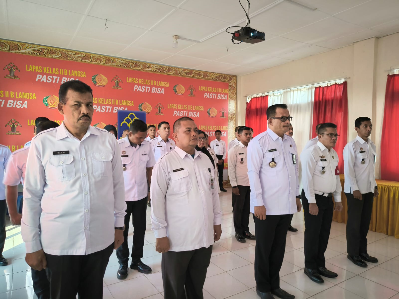 Media Berita Pantau Langsa – Kepala Lembaga Pemasyarakatan Kelas IIB Langsa A. Halim Faisal beserta jajaran mengikuti Apel Pagi Gabungan di lingkungan Kementerian Koordinator Hukum, Hak Asasi Manusia, Imigrasi, dan Pemasyarakatan (Kemenko H2IP), Kementerian Hukum, Kementerian Hak Asasi Manusia (HAM), serta Kementerian Imigrasi dan Pemasyarakatan secara virtual di Aula Lapas Langsa. Senin (3/2/2025).