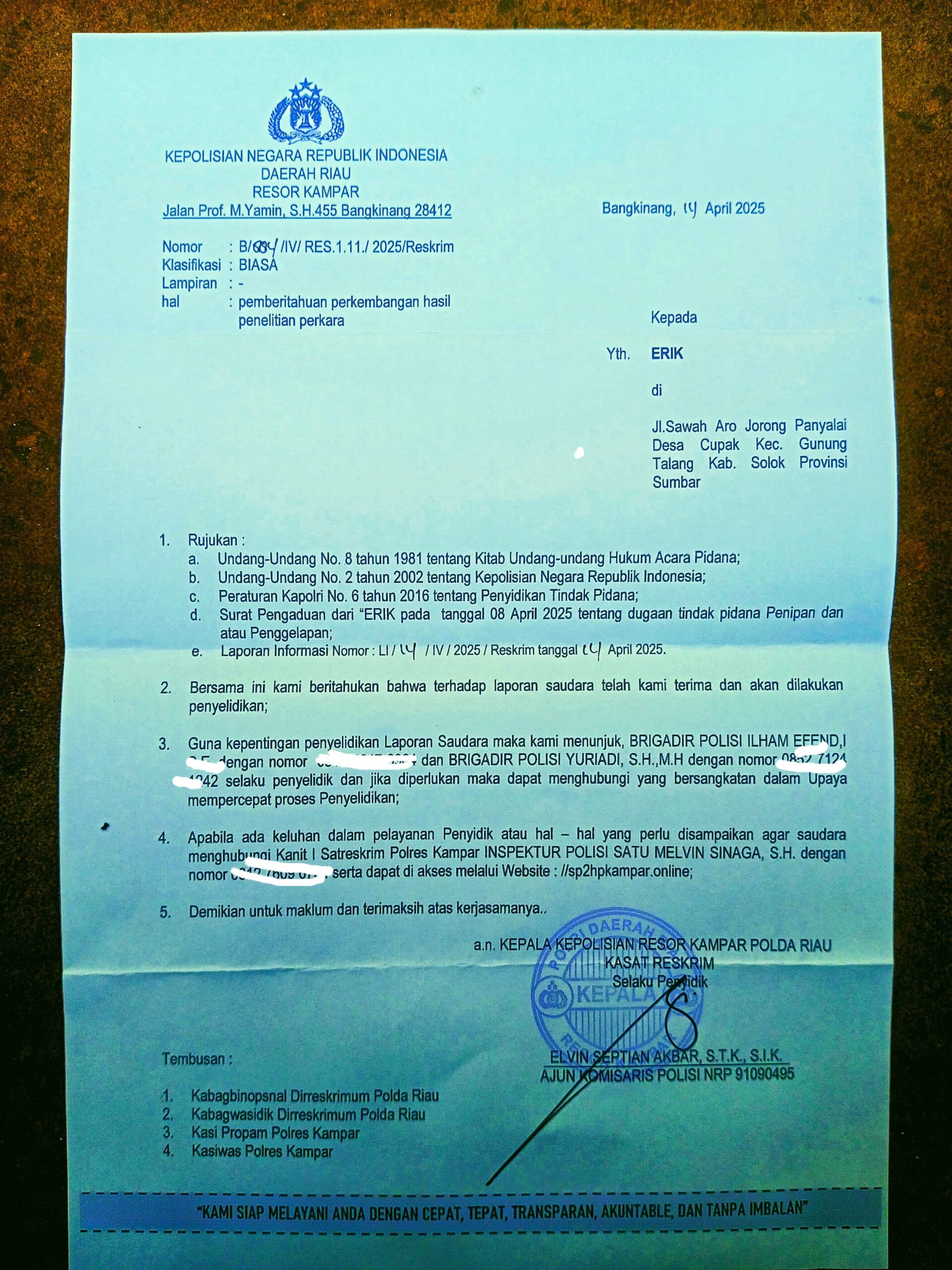 “Kami memberikan apresiasi kepada jajaran Polres Kampar yang telah cepat dan tanggap menerima serta memproses laporan dugaan tindak pidana penipuan ini. Ini menjadi bentuk kepercayaan masyarakat terhadap kinerja kepolisian,” ujar Hendriansyah.