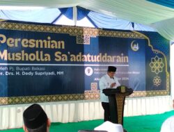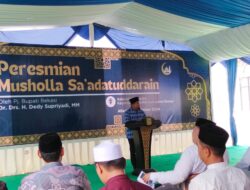 PJ. Bupati Bekasi Dedy Supriyadi menyampaikan apresiasi kepada Lurah Bahagia Khoirul Anwar, juga RT dan RW serta para donatur yang sudah bahu membahu bergotong royong terbangunnya Musholla Sa’adatuddarain ini.