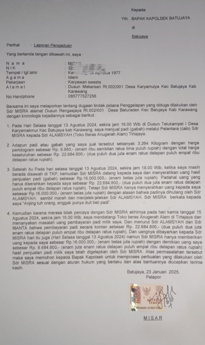 Mediaberitapantau.online~ Karawang,Menurut Keterangan Korban (Msr) Kepada Media Saat Ditemui Di Rumahnya Peristiwa Tersebut Terjadi Pada hari Selasa Tgl 13 Agustus 2024 Sekira Jam 16 : 00 WIB Di Dusun Telukampel 1 Desa Karyamakmur Kec.Batujaya Karawang, Saya Menjual Padi/Gabah Melalui Pelantara (Calo) Sdr.Msra Kepada Sdr.Alamsyah (Toko Beras Anugerah Alam) Tirtajaya