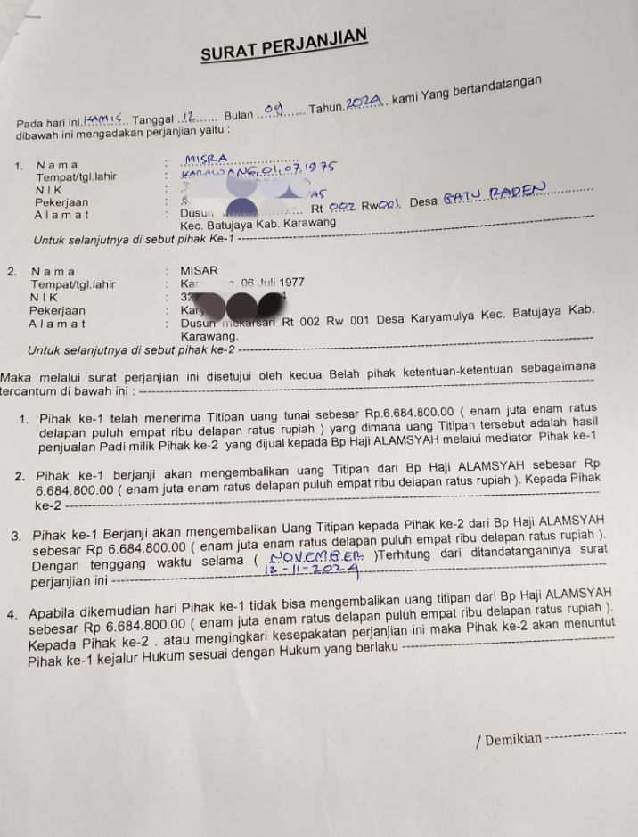 Sayapun minta bantuan aparat desa/trantib Desa karyamulya, berhasil membuat perjanjian dengan Msra, kesiapan membayar/mengembalikan uang saya, perjanjian tersebut di atas kertas dan di tandatangani serta di saksikan trantib Desa karyamulya, dengan isi surat apabila tidak di kembalikan uang tersebut Sdr.Msra kepada Sdr.Msr (Korban) maka Siap Di proses Sesuai Hukum Yang Berlaku,,