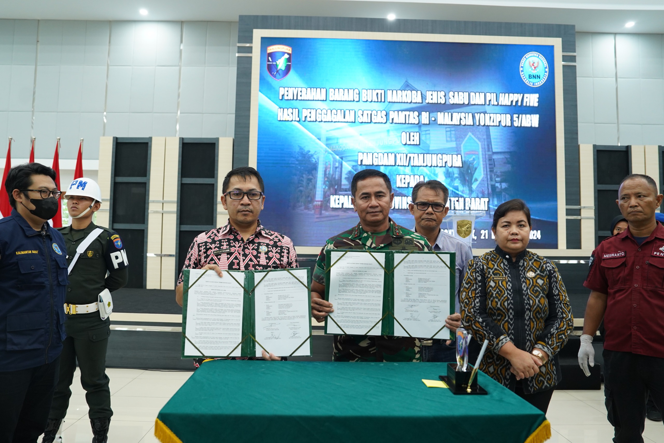 Adapun barang bukti Narkoba yang diserahkan berupa sabu 6.206,4 Gram dan Pil Happy Five sebanyak 70 strip (700) butir. Narkoba tersebut merupakan hasil penggagalan dari Satgas Pamtas RI-Malaysia Batalyon Zipur 5/ABW di wilayah perbatasan.