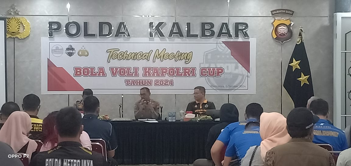 Mediaberitapantau.online PONTIANAK — Panitia tournamen Bola Bola voli Kapolri Cup 2024 Polda Kalbar mengadakan *technical meeting* untuk persiapan bergulirnya kompetisi *Bola Voli Kapolri Cup 2024 di Pontianak*. Pertemuan teknis tersebut berlangsung di Ruang Balai Kemitraan lantai 1 Polda Kalbar, Kegiatan ini dipimpin oleh Ketua seksi Pertandingan Kombes Pol Agung Setyo Wahyudi MM serta dihadiri oleh Pengurus PBVSI pusat dan pengurus PBVSI Kalbar serta seluruh perwakilan oficial tim dari 8(delapan) provinsi yang masuk dakam peserta babak 8 besar turnamen Bola Voli Kapolri Cup 2024 yang dilaksanakan di Pontianak. Rabu (02/10/24).
