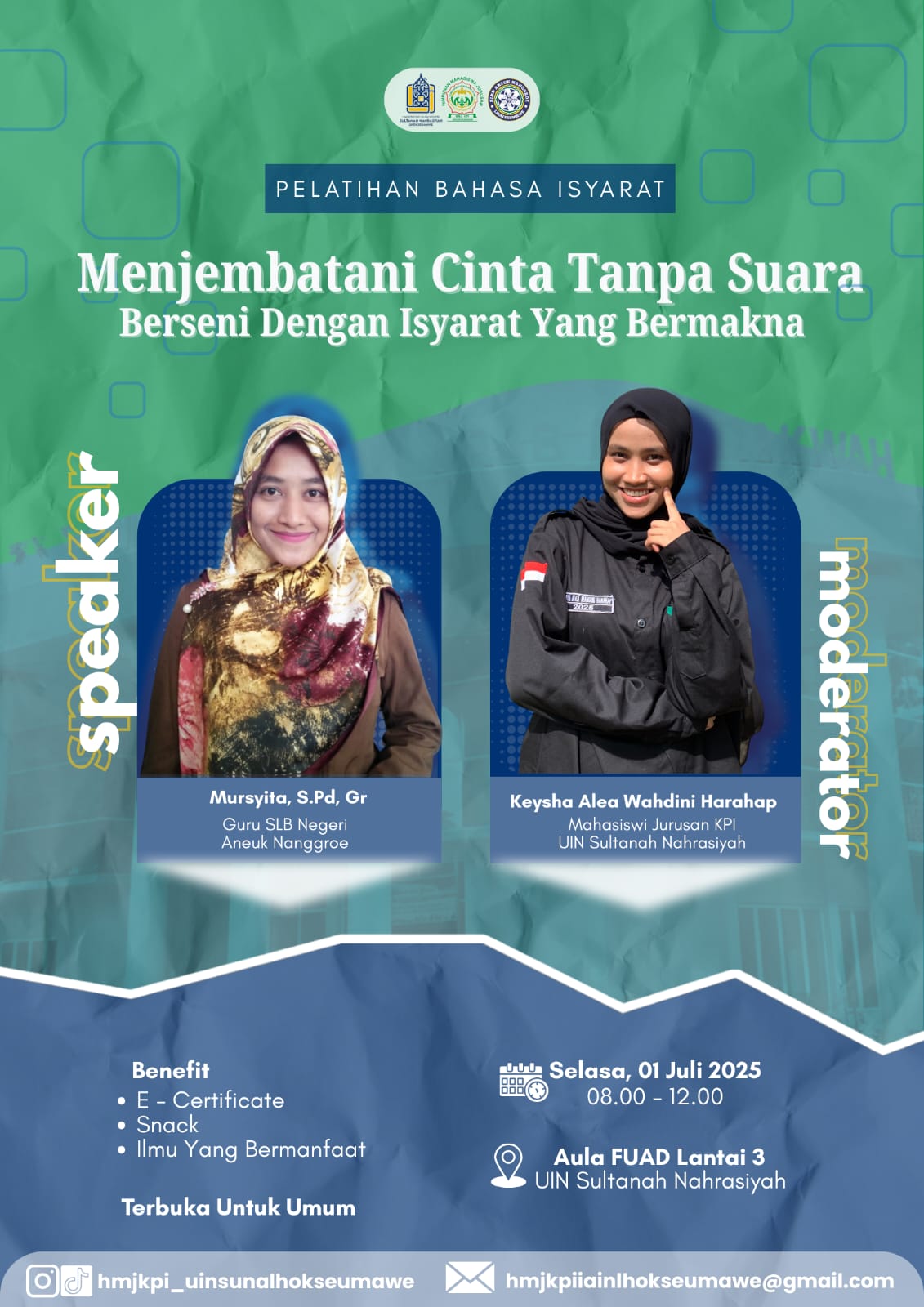 Pelatihan ini menghadirkan Mursyita, S.Pd, Gr., seorang guru dari SLB Negeri Aneuk Nanggroe sebagai pemateri utama, dengan pengalaman luas dalam pengajaran bahasa isyarat. Sementara itu, Keysha Alea Wahdini Harahap, mahasiswi KPI UIN Sultanah Nahrasiyah, akan bertindak sebagai moderator dalam pelatihan ini.