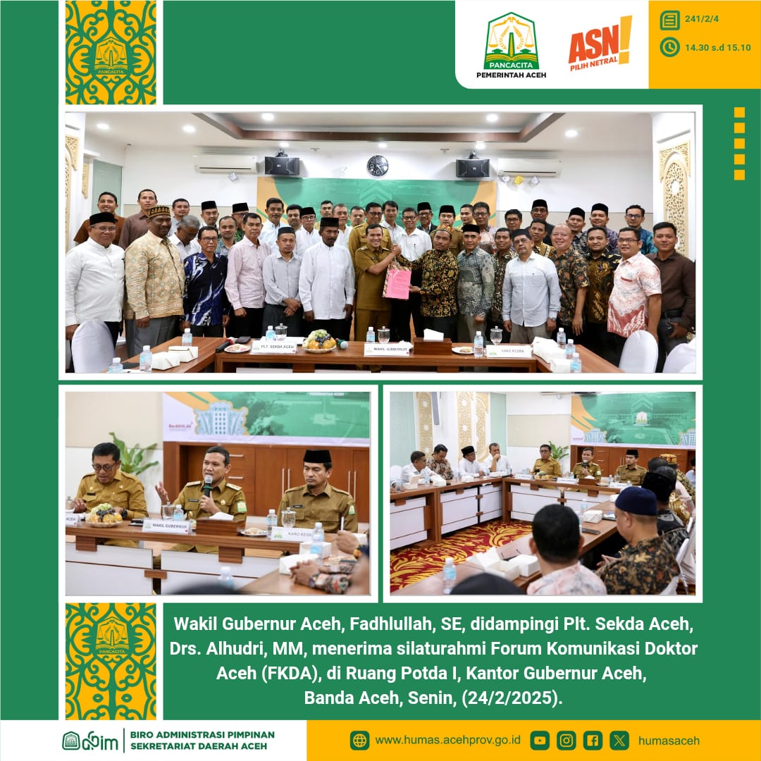 Mediaberitapantau.web.id BANDA ACEH — Sebanyak 55 ilmuan Aceh yang tergabung dalam Forum Komunikasi Doktor Aceh (FKDA) melakukan temu ramah dengan Wakil Gubernur Aceh, Fadhlullah (Dek Fadh) di Lantai III Kantor Gubernur Aceh, Senin, (24/2/2025).