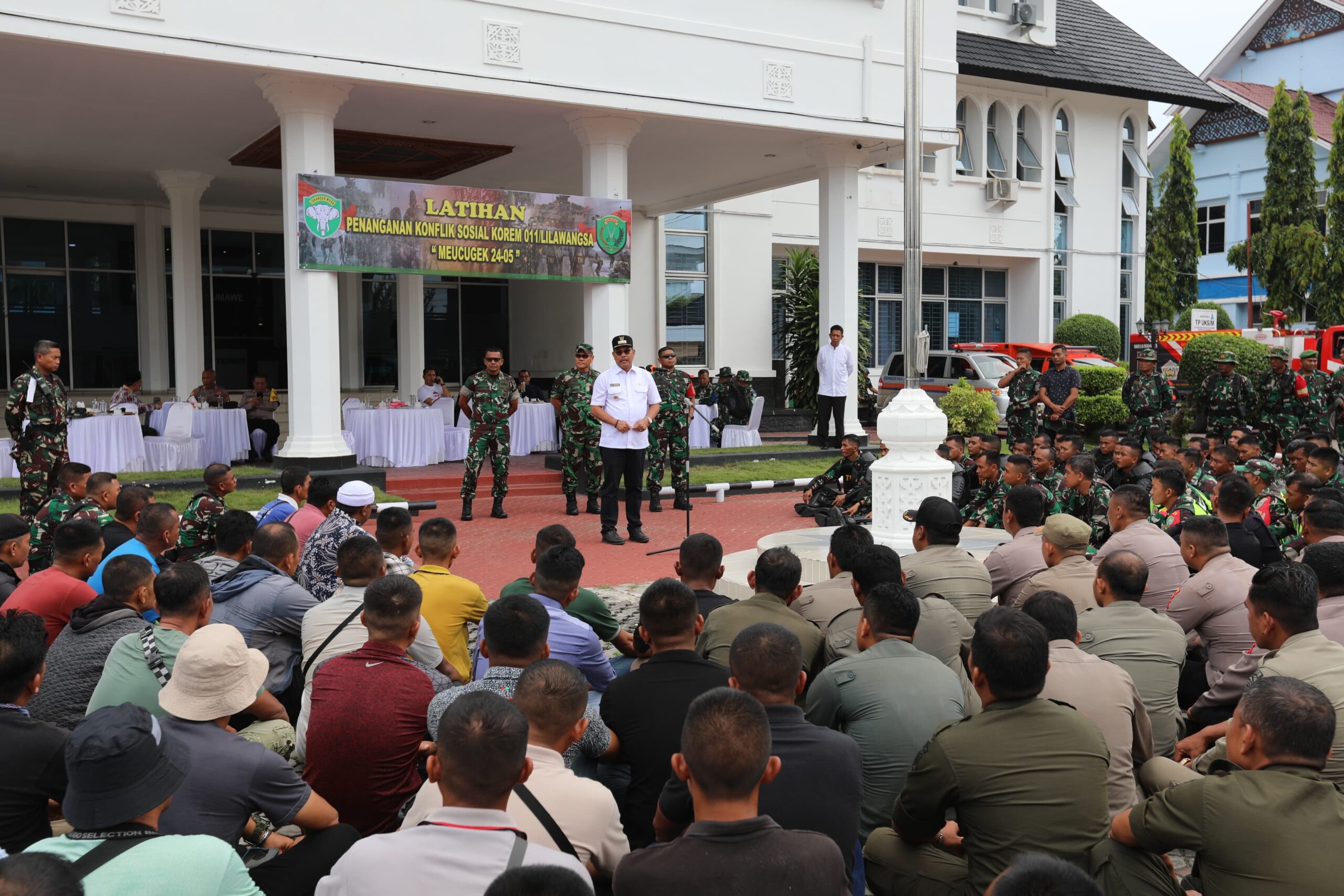 Kolonel Hasandi Lubis, didampingi oleh Komandan Korem 011/Lilawangsa Kolonel Inf Ali Imran, dan Dandim 0103 Aceh Utara Letkol Kav Makhyar, menyampaikan bahwa tujuan latihan ini adalah untuk meningkatkan kemampuan personel dalam merespons konflik sosial di wilayah Korem 011/Lilawangsa.
