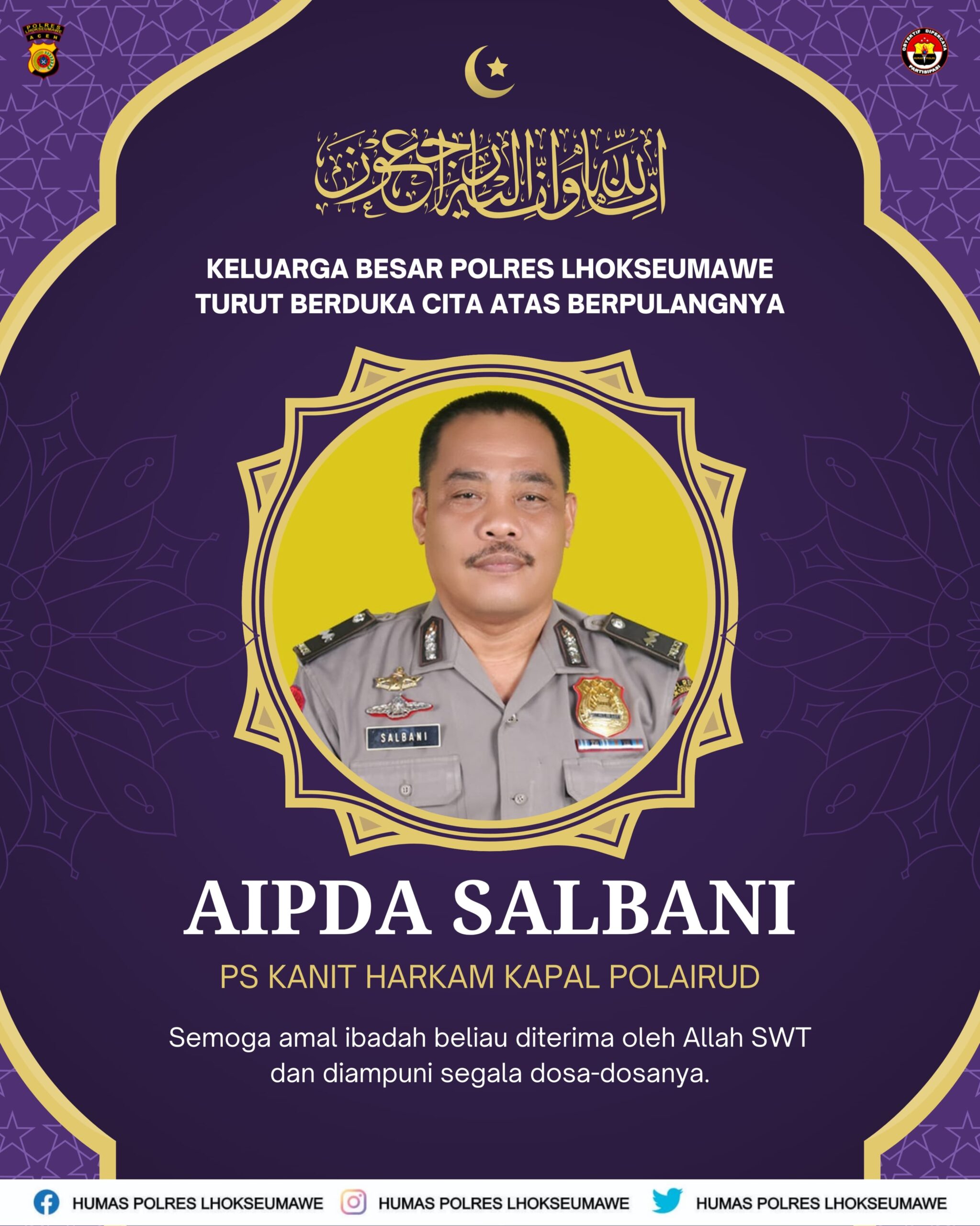 “Kami keluarga besar Polres Lhokseumawe turut berdukacita yang sedalam-dalamnya atas berpulangnya rekan kami, Aipda Salbani. Semoga amal ibadah beliau diterima di sisi Allah SWT dan diampuni segala dosa-dosanya,” ujar Kasi Humas.