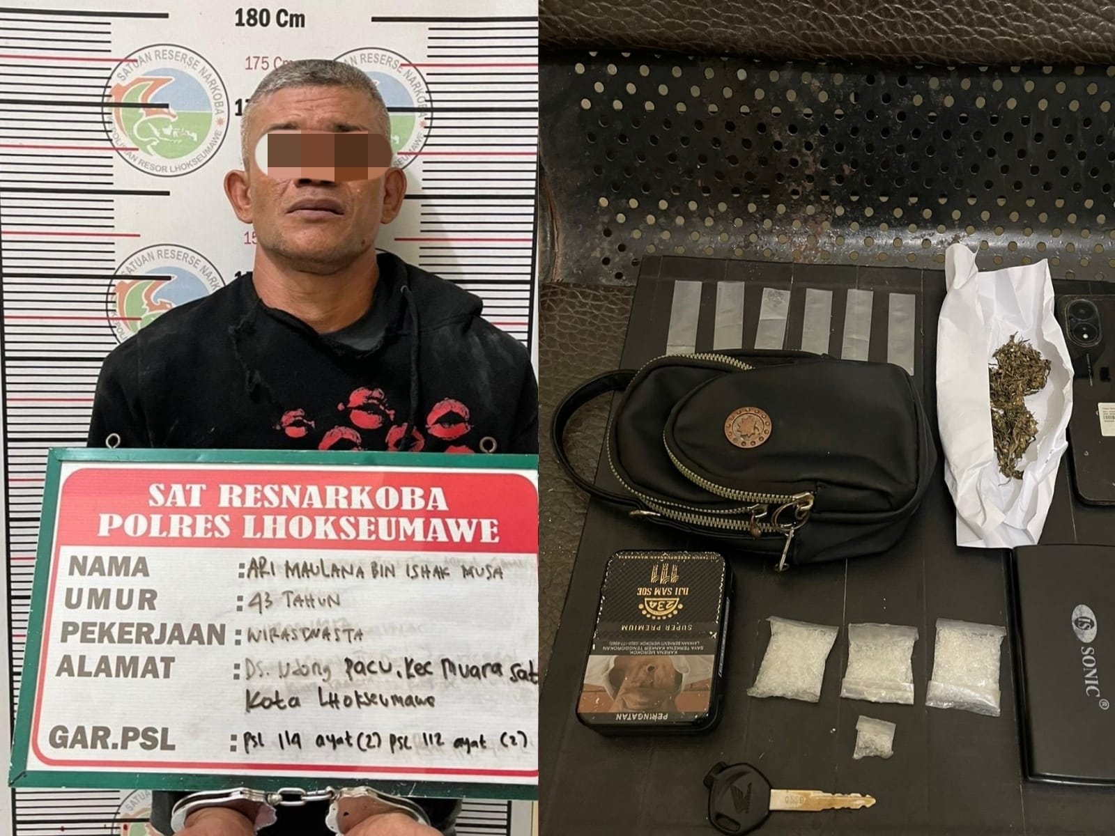 Kapolres Lhokseumawe AKBP Henki Ismanto, S.I.K melalui Kasat Narkoba AKP Wijaya Yudi Stira Putra mengatakan, dari tangan tersangka, polisi menyita barang bukti berupa Empat paket sabu seberat 14,97 gram bruto, Satu paket ganja seberat 5,30 gram bruto, Tas kecil hitam berisi paket narkotika, satu unit handphone, timbangan digital, dan kotak rokok dan satu unit sepeda motor Honda Vario hitam dengan nomor polisi BL-4093-QZ.