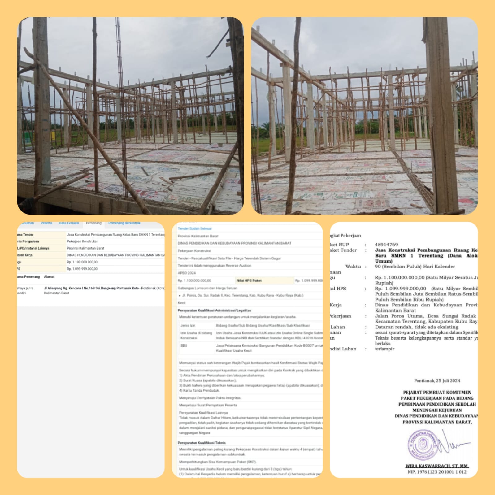 Mediaberitapantau.online KUBU RAYA — Proyek pembangunan tiga ruang kelas baru (RKB) di SMK Negeri 1 Kecamatan Terentang, Kabupaten Kubu Raya, diduga mangkrak setelah kontraktor pelaksana terlihat meninggalkan pekerjaan. Proyek senilai Rp 1.100.000.000 dari APBD Tahun Anggaran 2024 ini sebelumnya dimenangkan oleh CV Cahaya Putra Mandiri melalui proses lelang oleh Pokja Pengadaan Barang dan Jasa Provinsi Kalimantan Barat dengan nilai penawaran Rp 846.515.122,11.