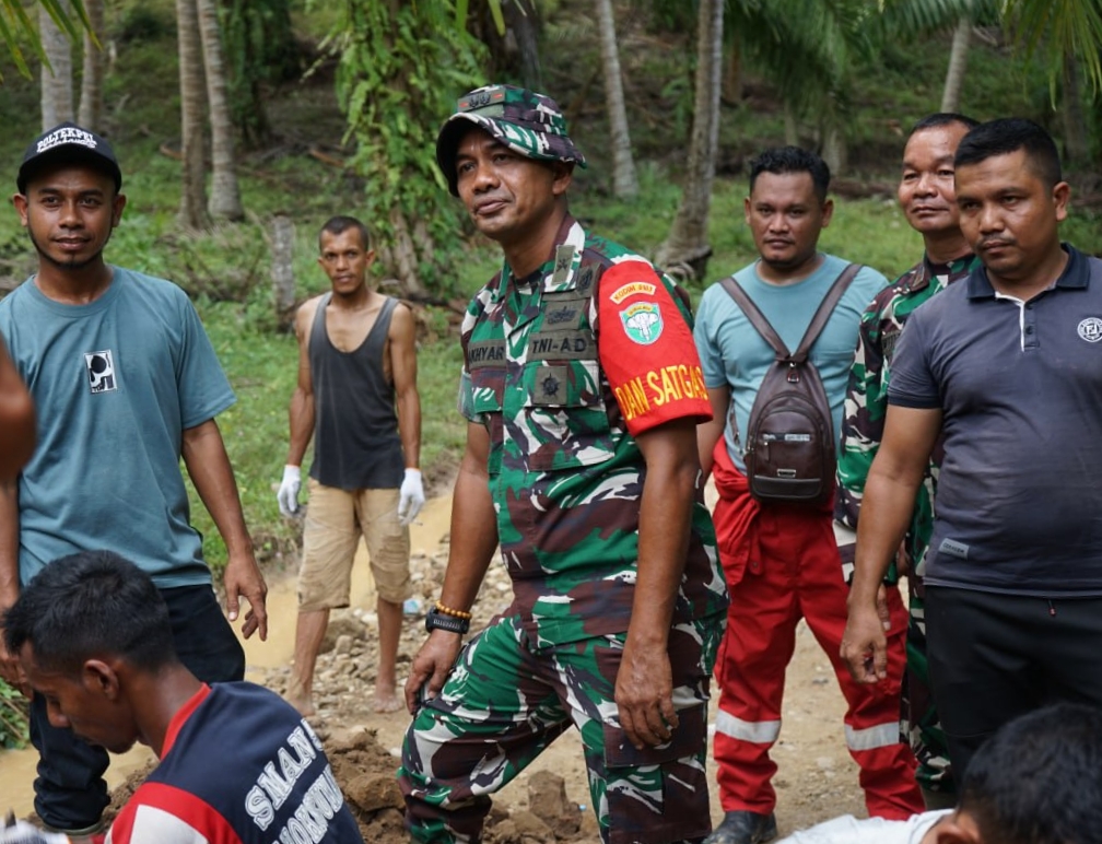 Personel Satgas mendapatkan bantuan dari masyarakat sekitar lokasi untuk bergotong royong di program Tentara Manunggal Masuk Desa (TMMD) ke 122 ini, ikut mempercepat capaian kinerja pembangunannya.