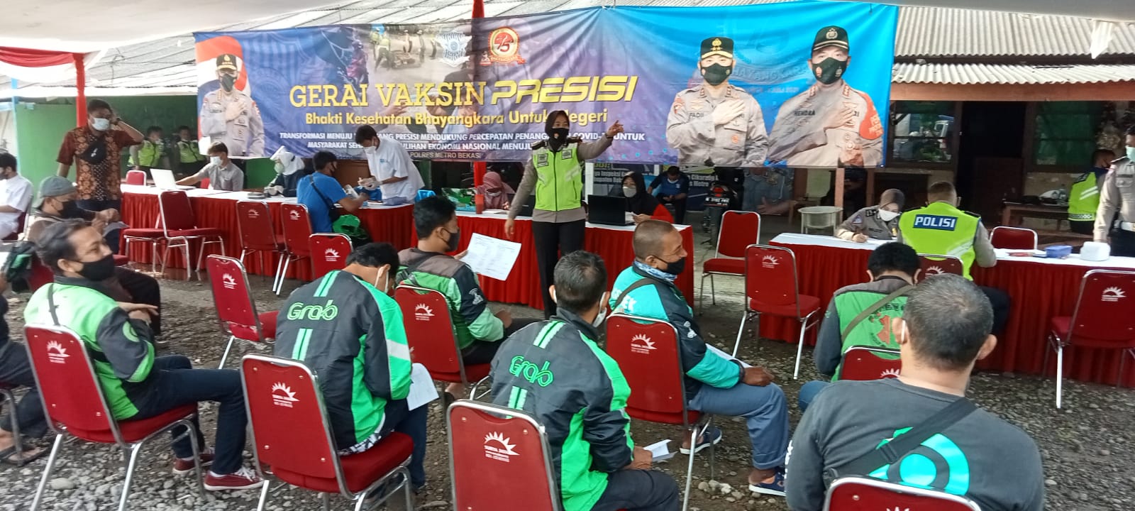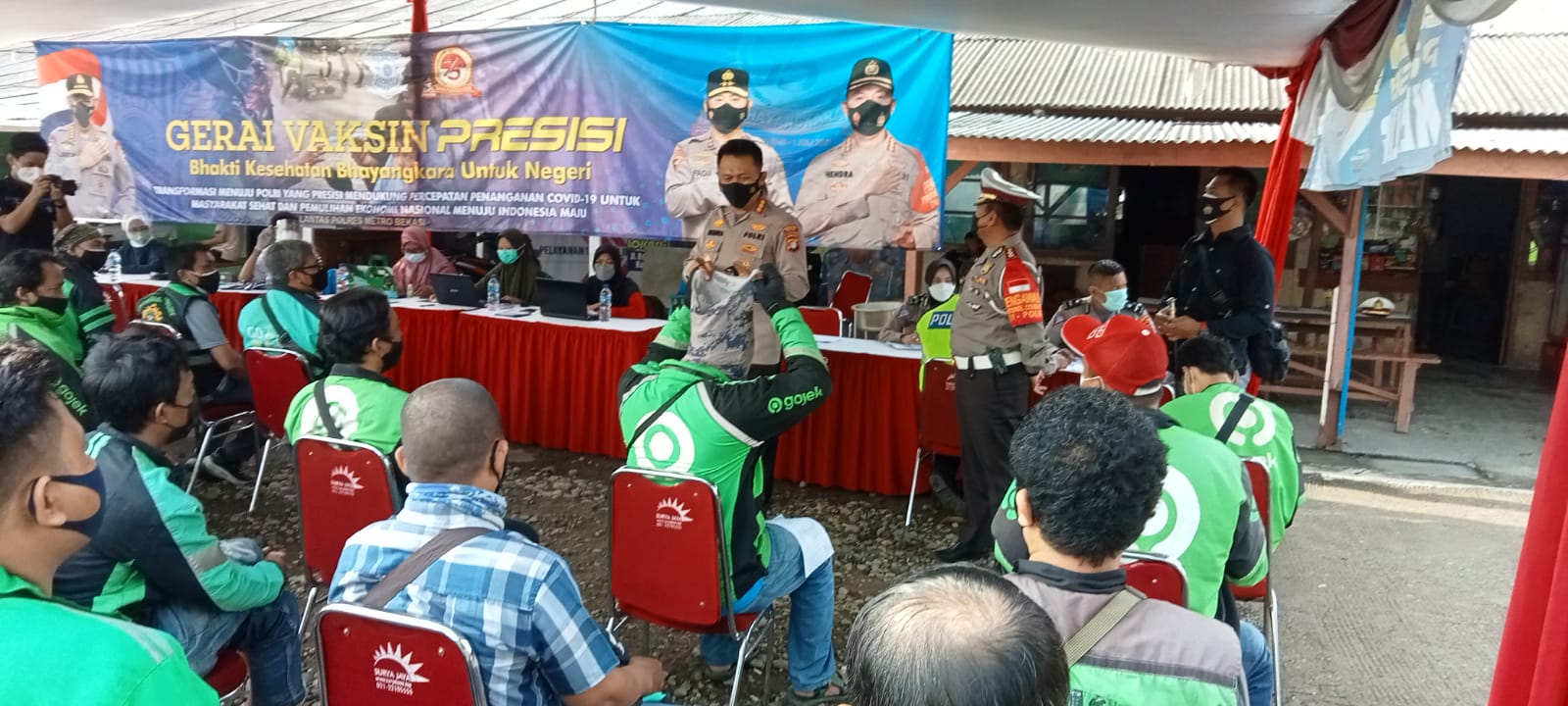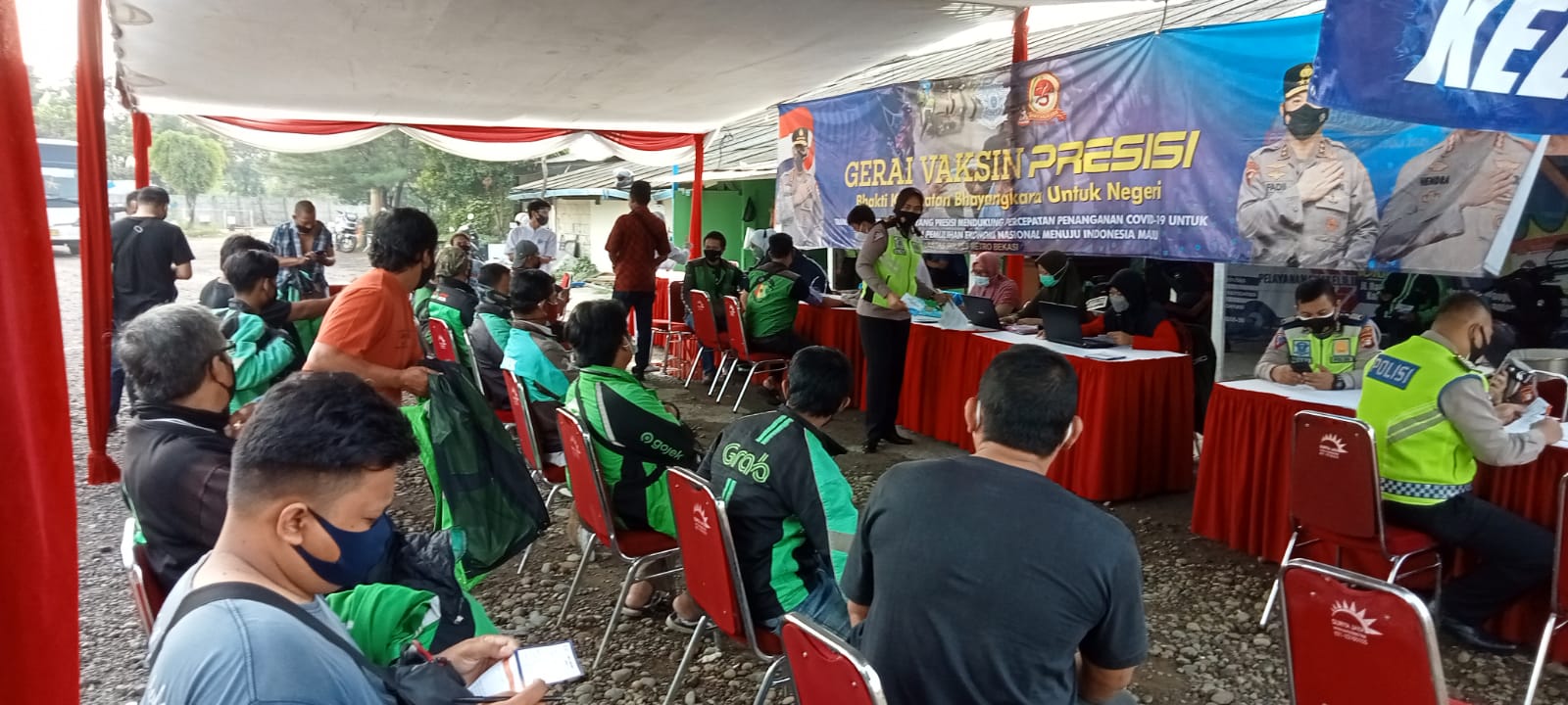 Dengan melakukannya vaksinasi di halaman kantor laka lantas polres metro Bekasi yang berada di jalan raya infeksi kali malang, kecamatan Cikarang Utara,kabupaten Bekasi, ratusan ojek online dengan mengedepankan protokol kesehatan ketat, mengantri untuk di lakukan vaksinasi oleh petugas kesehatan di bantu tim relawan di tempat tersebut.