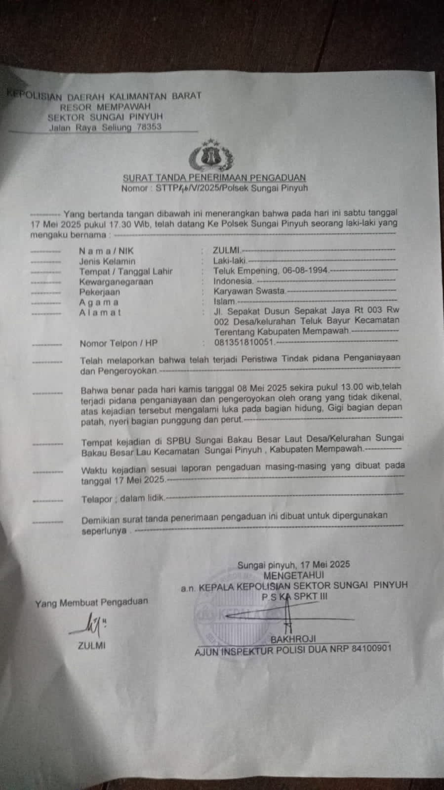 Korban mengalami luka serius, di antaranya hidung patah, gigi depan rontok, serta memar di bagian perut dan punggung. Zulmi telah melaporkan kejadian ini ke Polsek Sungai Pinyuh dengan nomor laporan STTP/46/V/2025 tertanggal 17 Mei 2025.