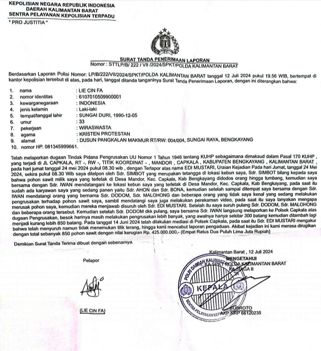 Perkara ini teregistrasi dalam Laporan Polisi Nomor: LP/B/222/VII/2024/SPKT POLDA KALIMANTAN BARAT tertanggal 12 Juli 2024. Lie Cin Fa mengaku telah menguasai lahan yang disengketakan sejak tahun 2011 berdasarkan Surat Pernyataan Tanah (SPT) Tahun 2011, dan memperkuat hak penguasaan itu lewat putusan Pengadilan Negeri Bengkayang Nomor: 33/Pdt.G/2024/PN Bek, di mana ia menang dalam perkara perdata melawan Edi Mustari, penggugat dalam perkara tersebut.
