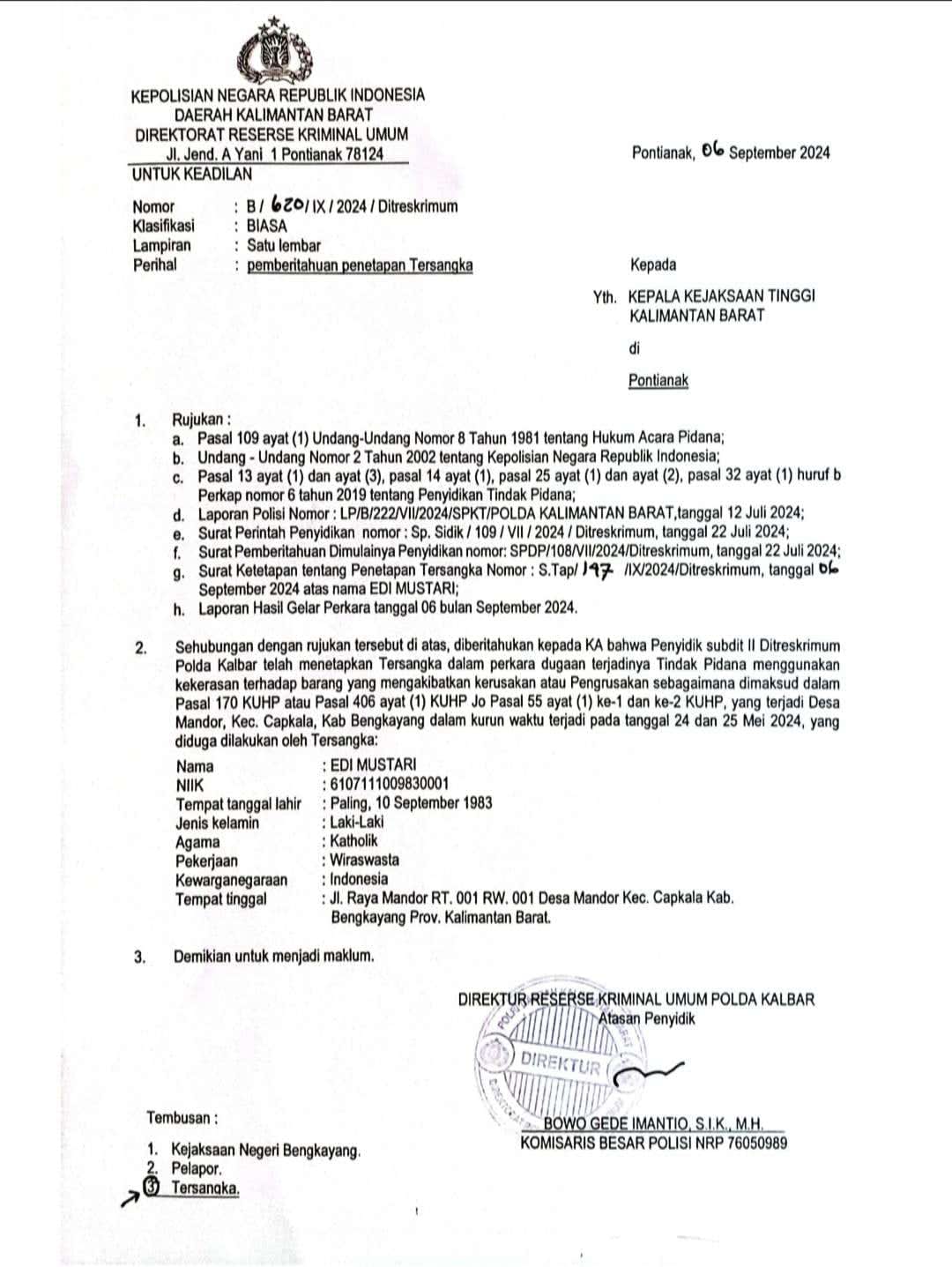 Namun, dalam perkara pidana terpisah, Edi Mustari yang diduga telah merusak sekitar 850 batang pohon sawit dan ratusan pohon pinang milik Lie Cin Fa di Desa Mandor, Kecamatan Capkala, telah ditetapkan sebagai tersangka oleh penyidik Polda Kalbar. Hal itu tertuang dalam Surat Pemberitahuan Penetapan Tersangka Nomor: B/620/IX/2024/Ditreskrimum Polda Kalbar, yang dikeluarkan sejak September 2024.