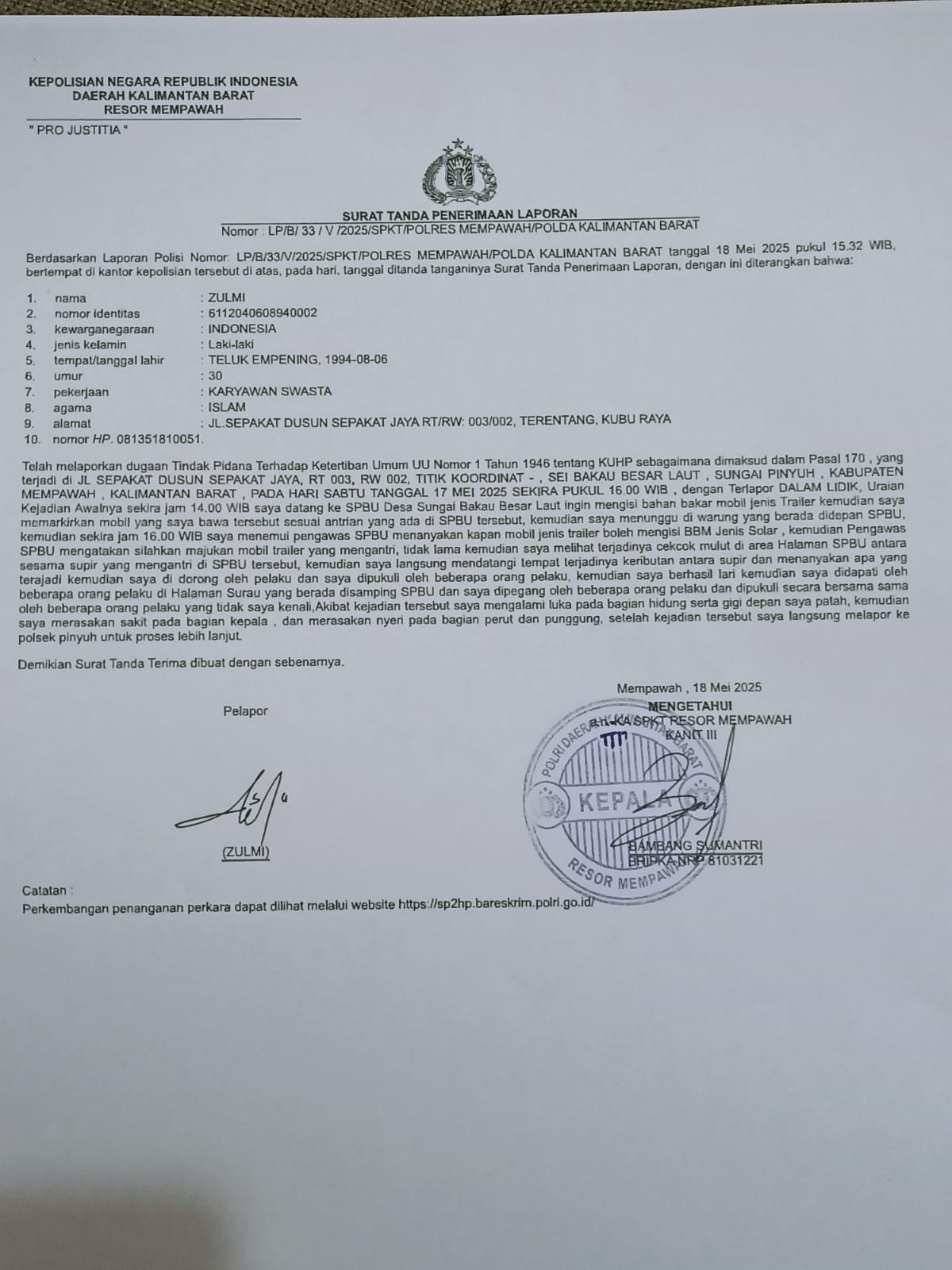 Zulmi melaporkan peristiwa tersebut ke Polres Mempawah sehari setelah kejadian, dengan nomor laporan LP/B/33/V/2025/SPKT/Polres Mempawah/Polda Kalbar. Laporan diterima oleh penyidik Bripka Bambang Sumantri.