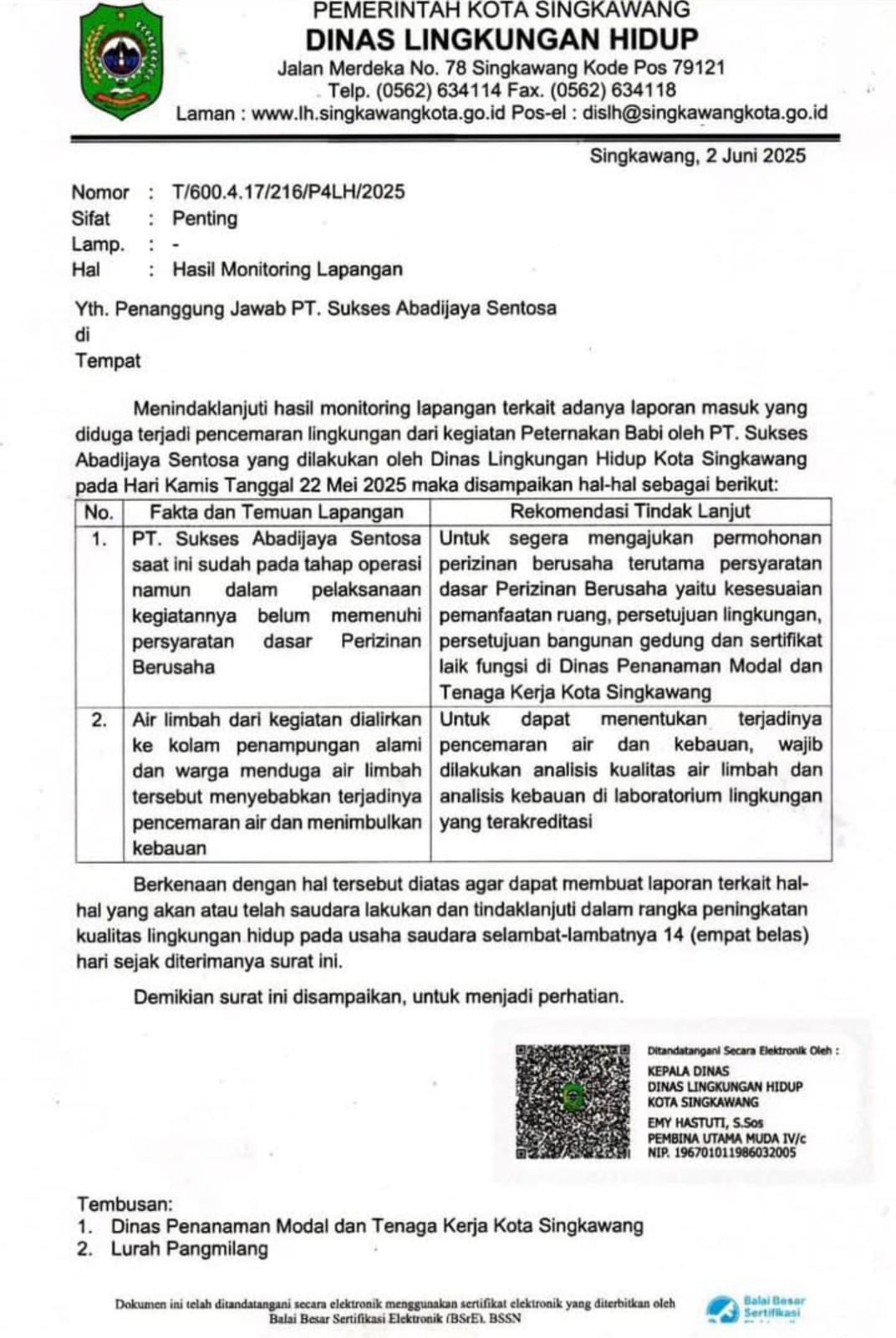 Temuan dari Dinas Lingkungan Hidup (DLH) Kota Singkawang turut memperkuat dugaan pelanggaran. Dalam konfirmasi melalui pesan WhatsApp, Kepala DLH Kota Singkawang membenarkan bahwa pihaknya telah menerbitkan surat resmi terkait temuan pelanggaran lingkungan di lokasi peternakan.